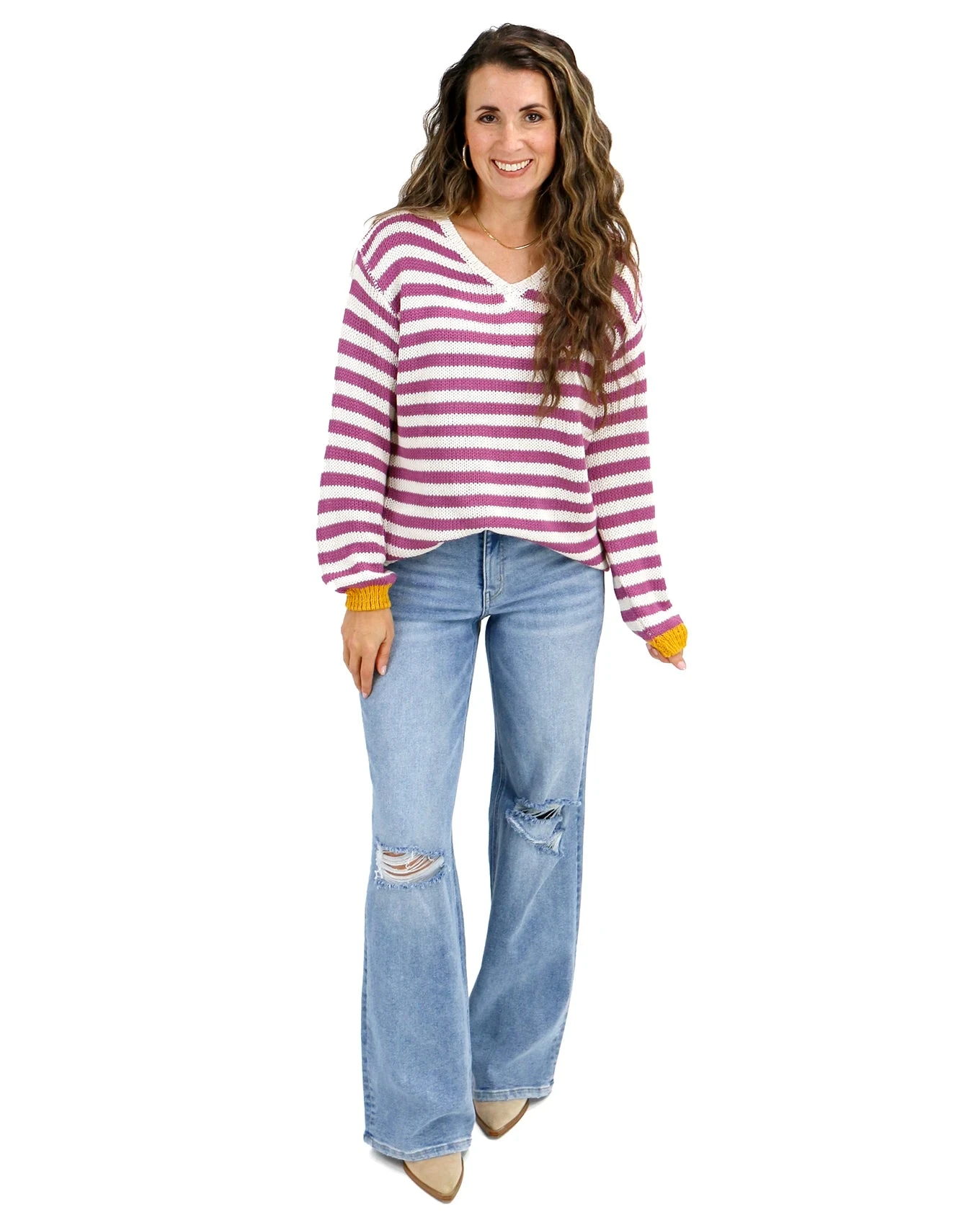 The striped sweater you’ll love berry much! Introducing the new Striped V-Neck Sweater – an easy go-to that takes the fuss out of getting dressed! Stripes are in this season, and we created this spring pullover sweater with a flattering striped pattern in a spring-ready berry hue that brightens up any day. Goldenrod yellow sleeve cuffs add a playful touch, making this slouchy sweater a fun way to embrace the warming temps – or to bring some sunshine in on those lingering chilly days!