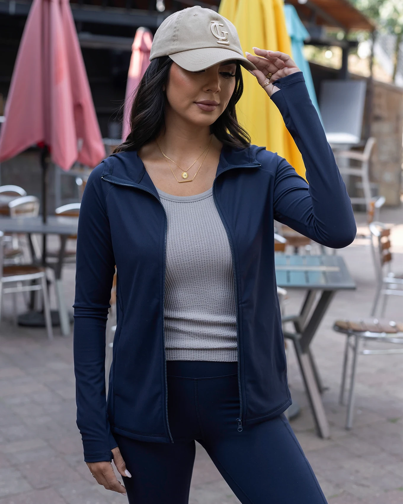 The Best Athletic Jacket is back! Now available in a full zipper design, the new Navy Best Athletic Zip Up Jacket gives you a versatile option for layering up as you kick your workout style into high gear! Pair this fitted athletic jacket with the coordinating Best Squat Proof Leggings or style solo with your favorite workout or athleisure faves for an easy, flattering activewear look!