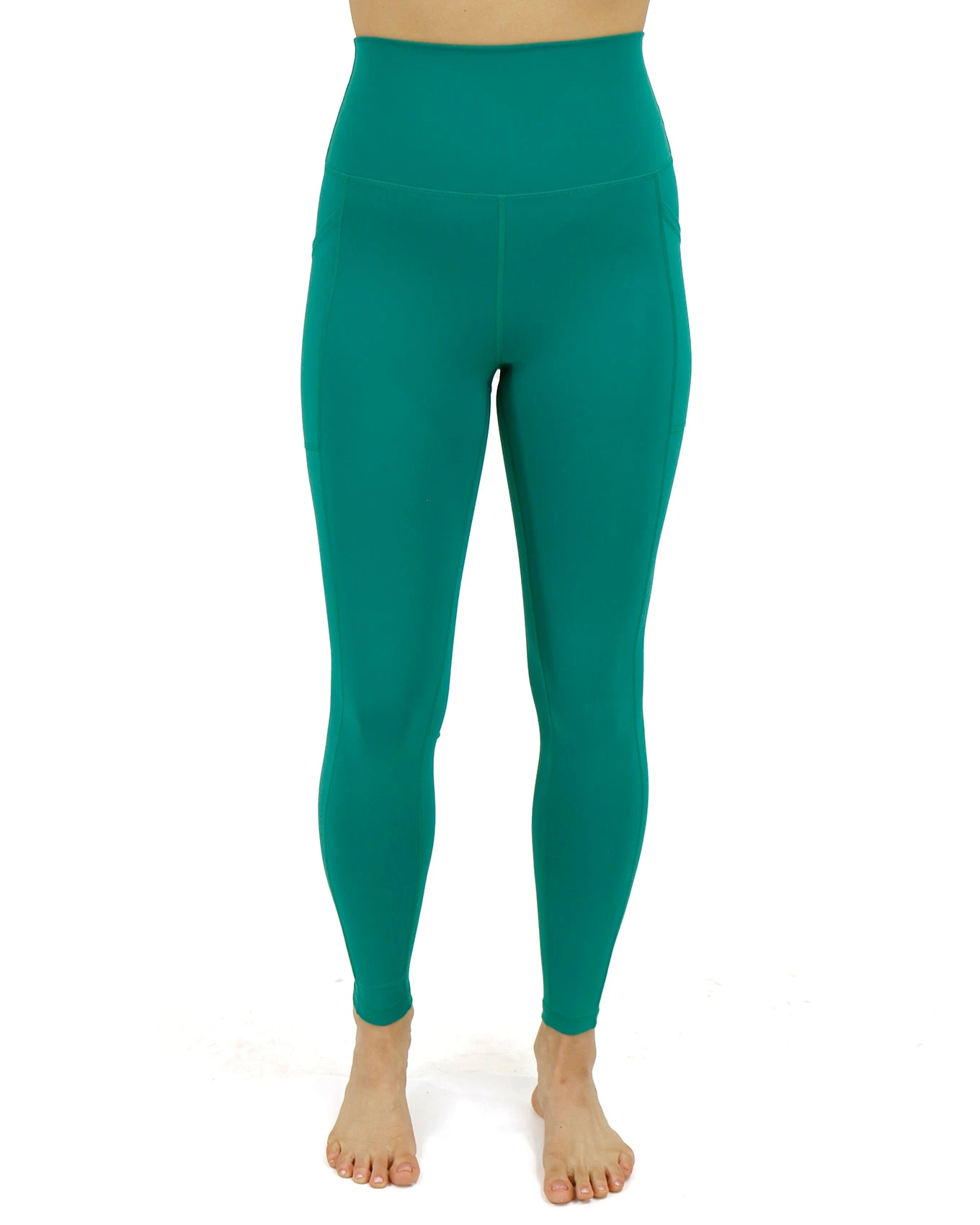 - Lightweight, high waisted jungle green athleisure leggings with wide, no-roll comfort yoga-style waistband – now with functional side pockets!