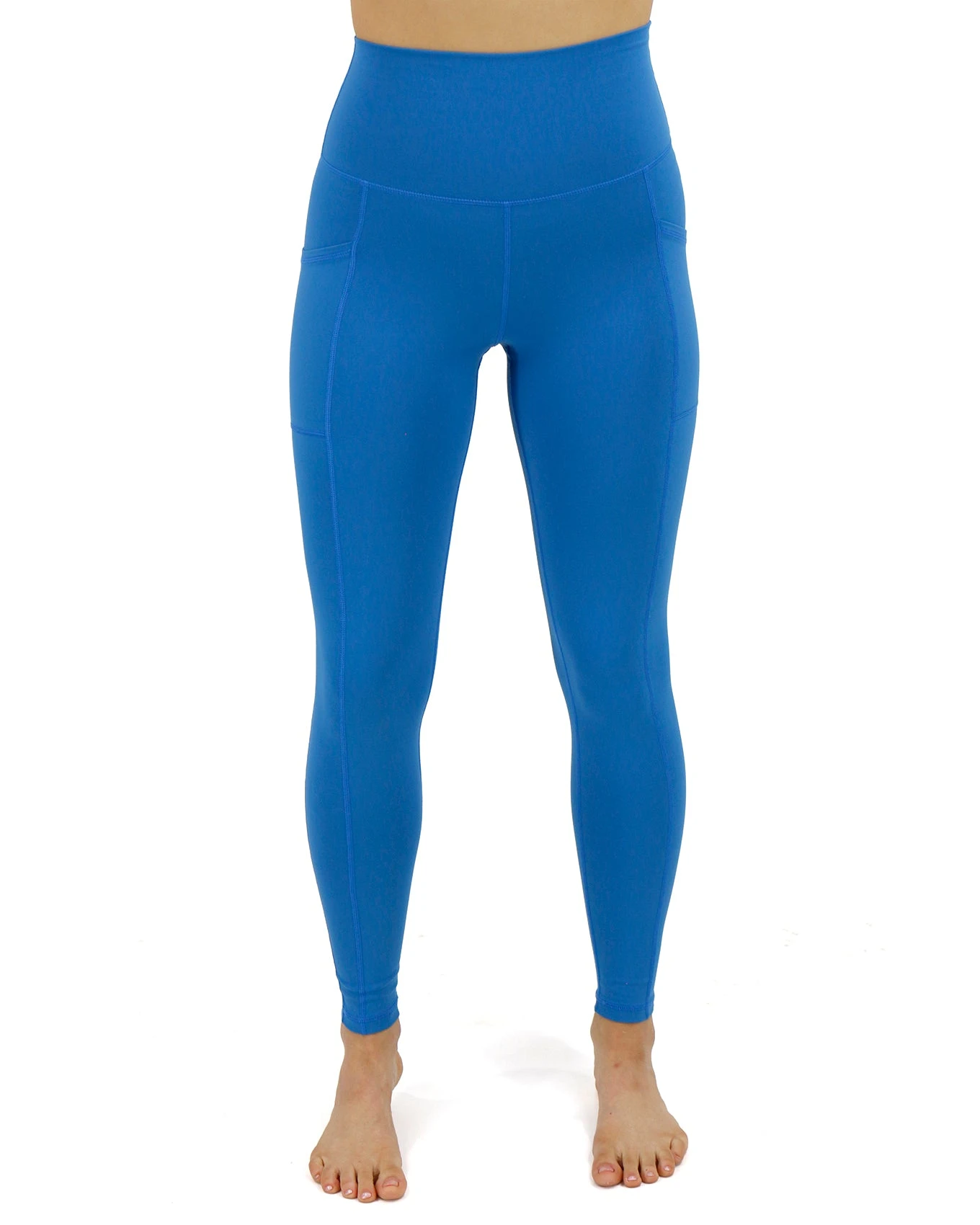 - Lightweight, high waisted pacific blue athleisure leggings with wide, no-roll comfort yoga-style waistband – now with functional side pockets!