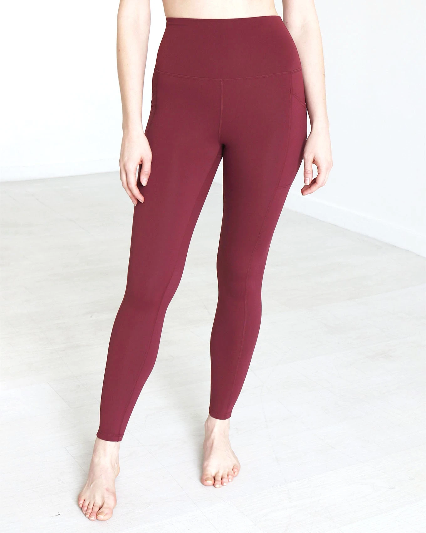 - Lightweight, high waisted, athleisure leggings in port with wide, no-roll comfort yoga-style waistband – now available with functional side pockets!