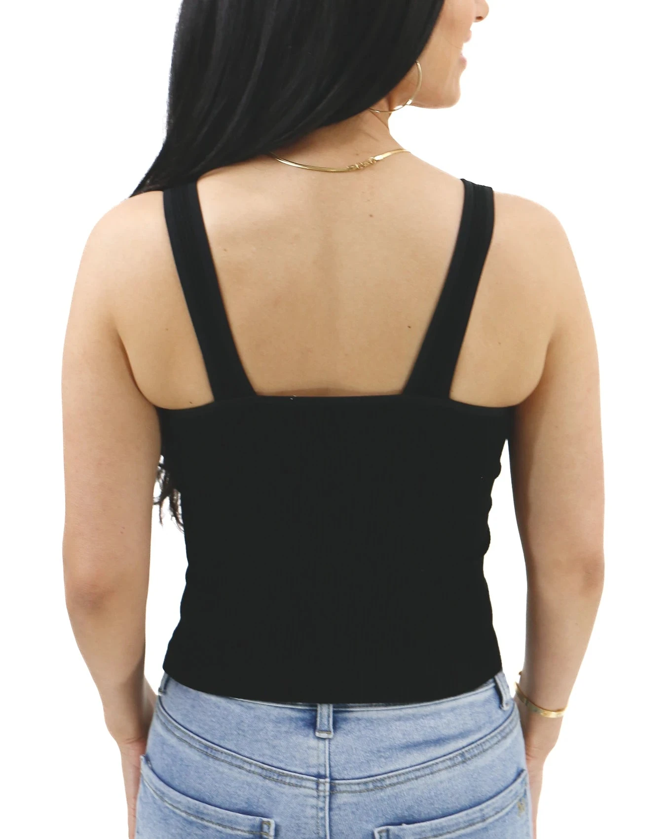 - Textured, ribbed, black tank top with built-in bra and flattering v-neckline