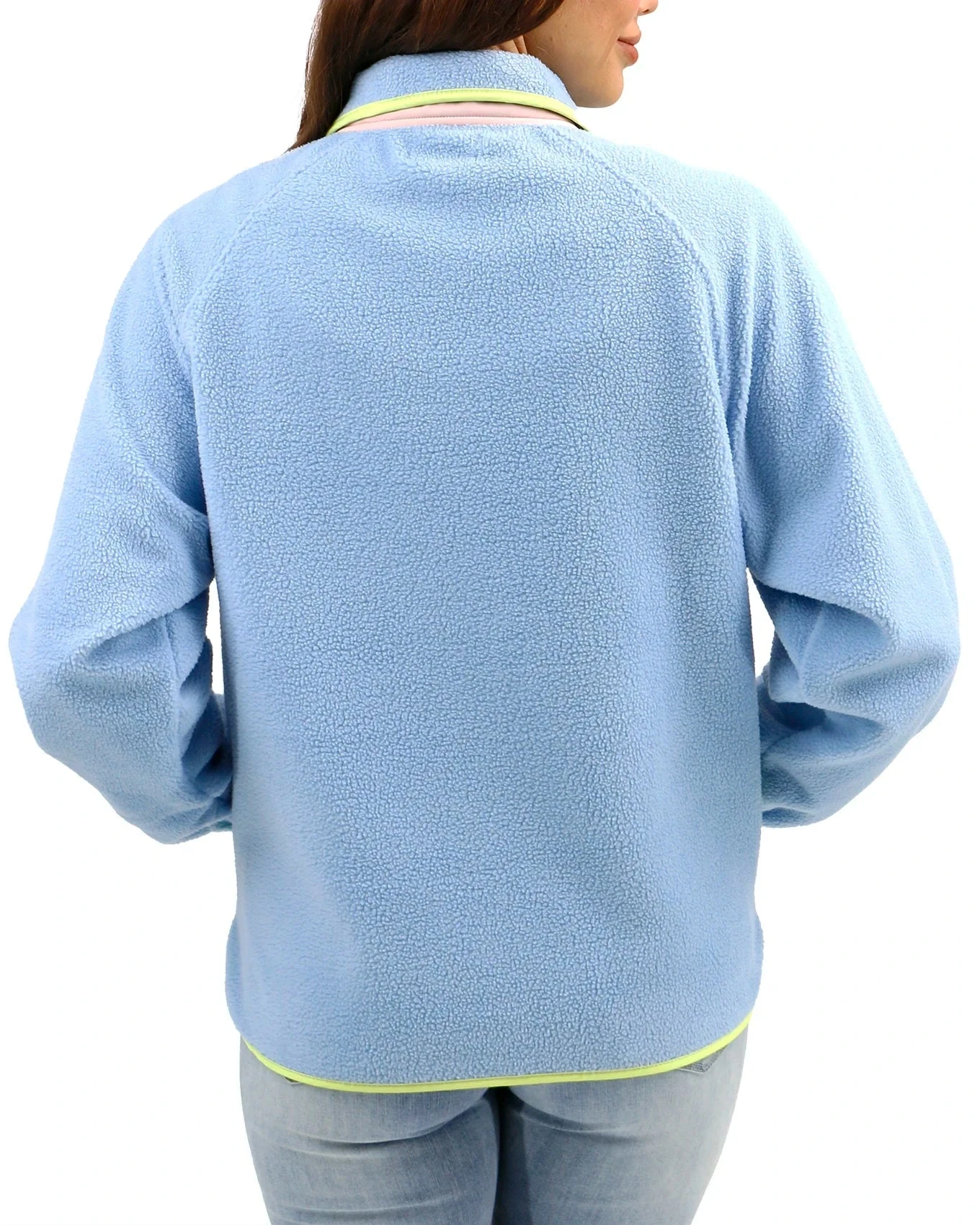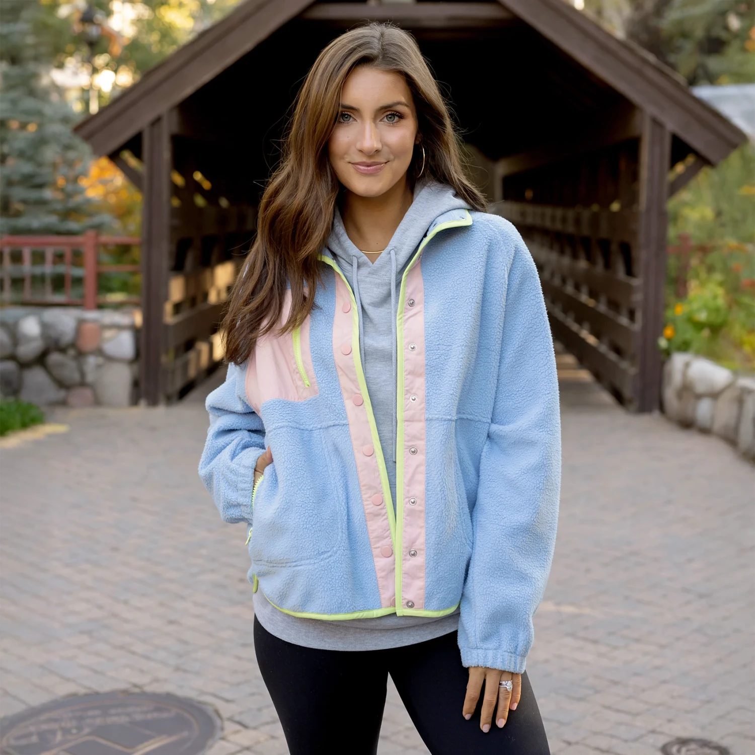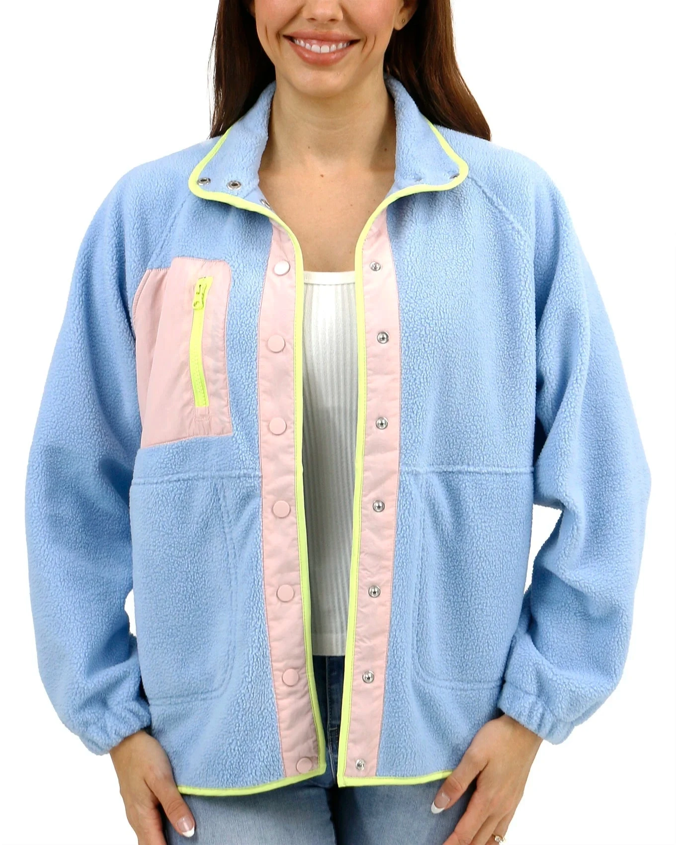 The all new Colorblock Fleece Jacket puts the fun in functional! Made with soft pastel blue fleece, this colorblock jacket features contrasting blush and yellow pocket and trim detail, letting you make an easy style statement as you put the finishing touch on your day to day look. Zip up pockets keep your hands toasty warm and your phone safely secured, while the functional snap up front lets you layer this jacket easily over tees and tops! Trust us, getting dressed on chilly days never felt so fun!