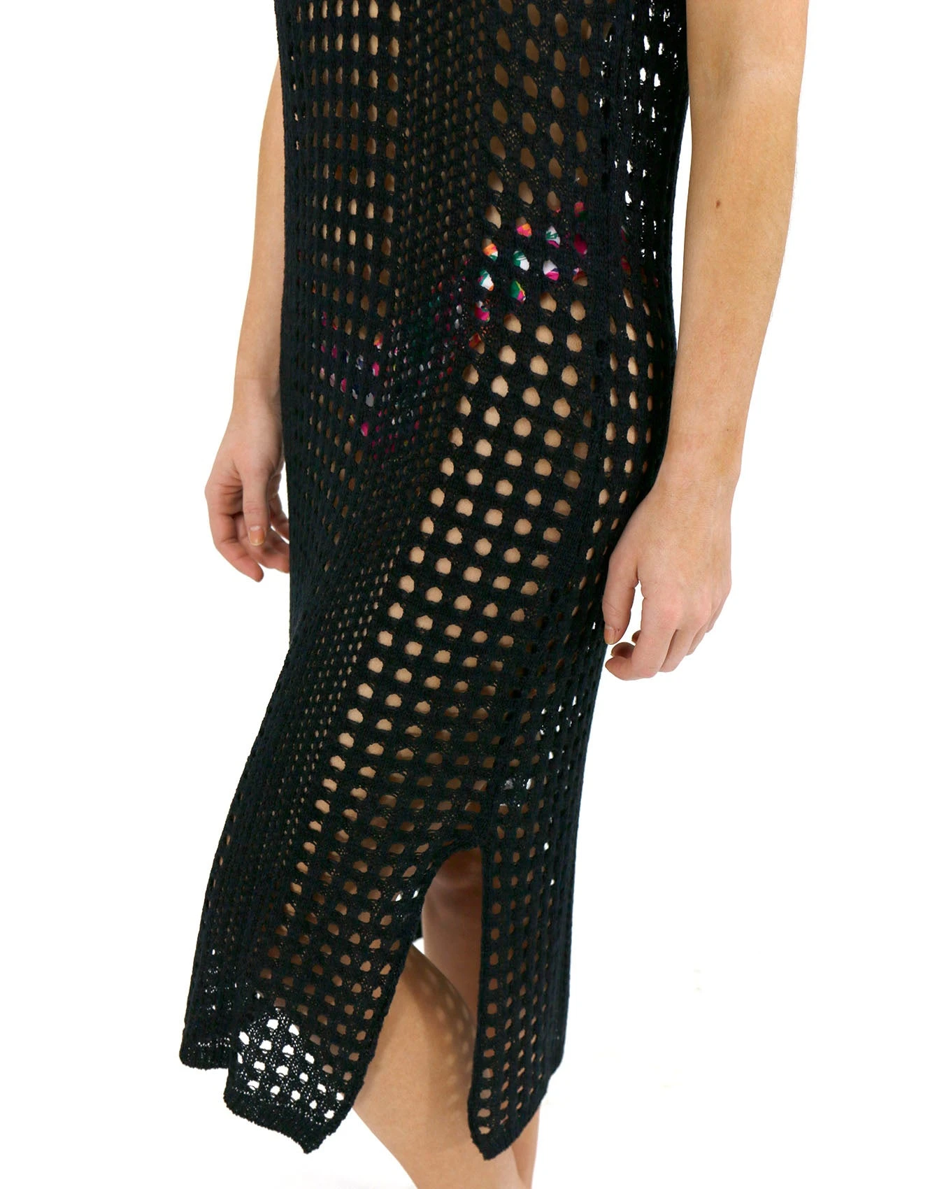 Stay fabulous and fashionable poolside with our newest Black Capri Knit Swim Cover-up! This crochet cover up dress is sleeveless, lightweight, and breathable, making it the perfect addition to your swimwear collection. The tea-length cut, open knit design and flattering side slits will keep you effortlessly stylish while you relax by the pool.