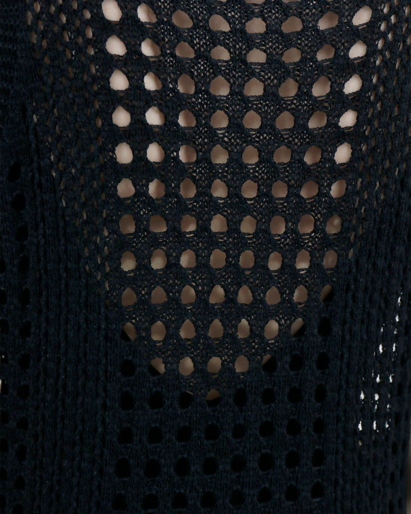 Open knit swim cover up dress. Cover up is sleeveless and tea length with side slits. Knit has good stretch. Fitted style with a true to size fit. If between sizes, size up. Or size up if you prefer a general looser fit.