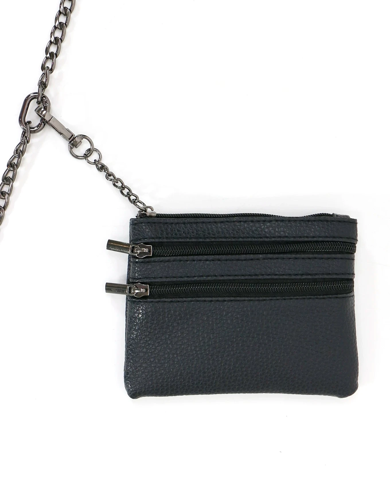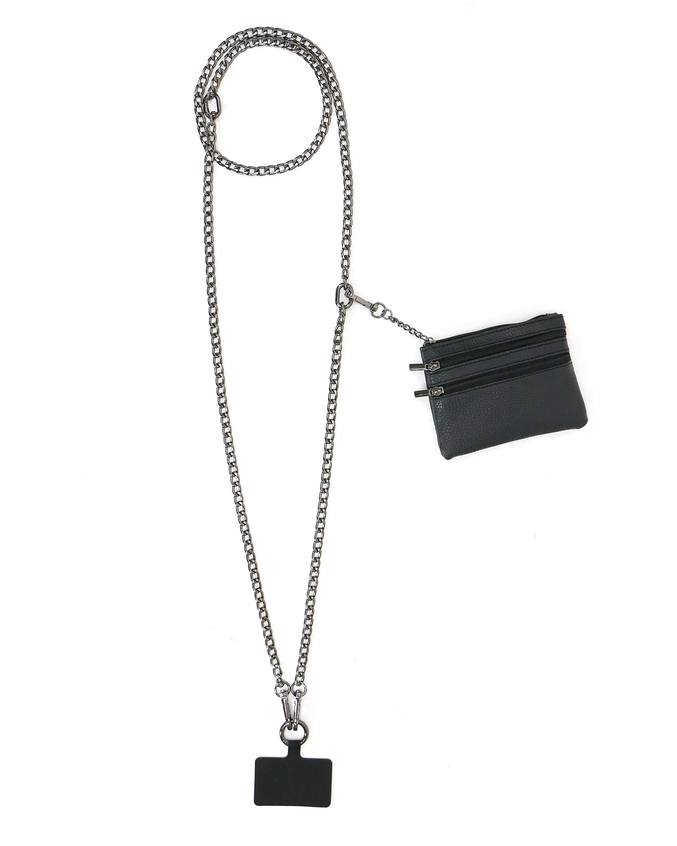 Crossbody cellphone chain with wallet. Wallet is faux leather and features three zipper closure pockets. Metal chain has multiple clasps for adjustable length. Metal chain end features one paper plate to attach phone.