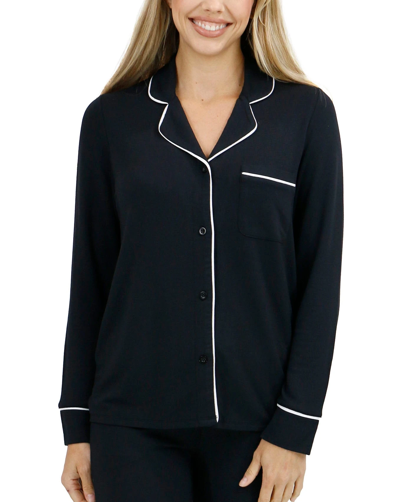 - Classic black long sleeved button up pajama top with white contrast trim