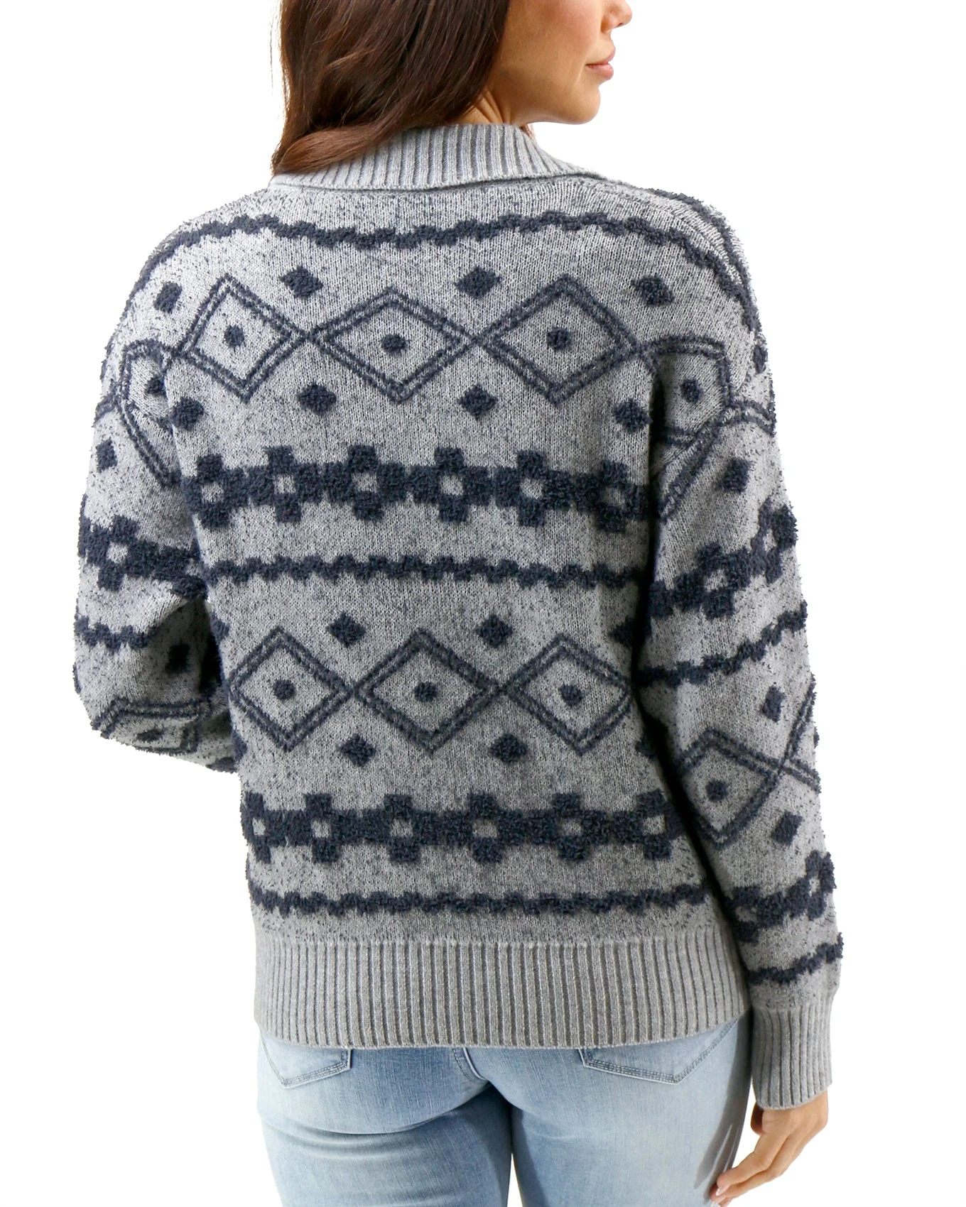 - Versatile long sleeved collared sweater with mixed knit intarsia pattern