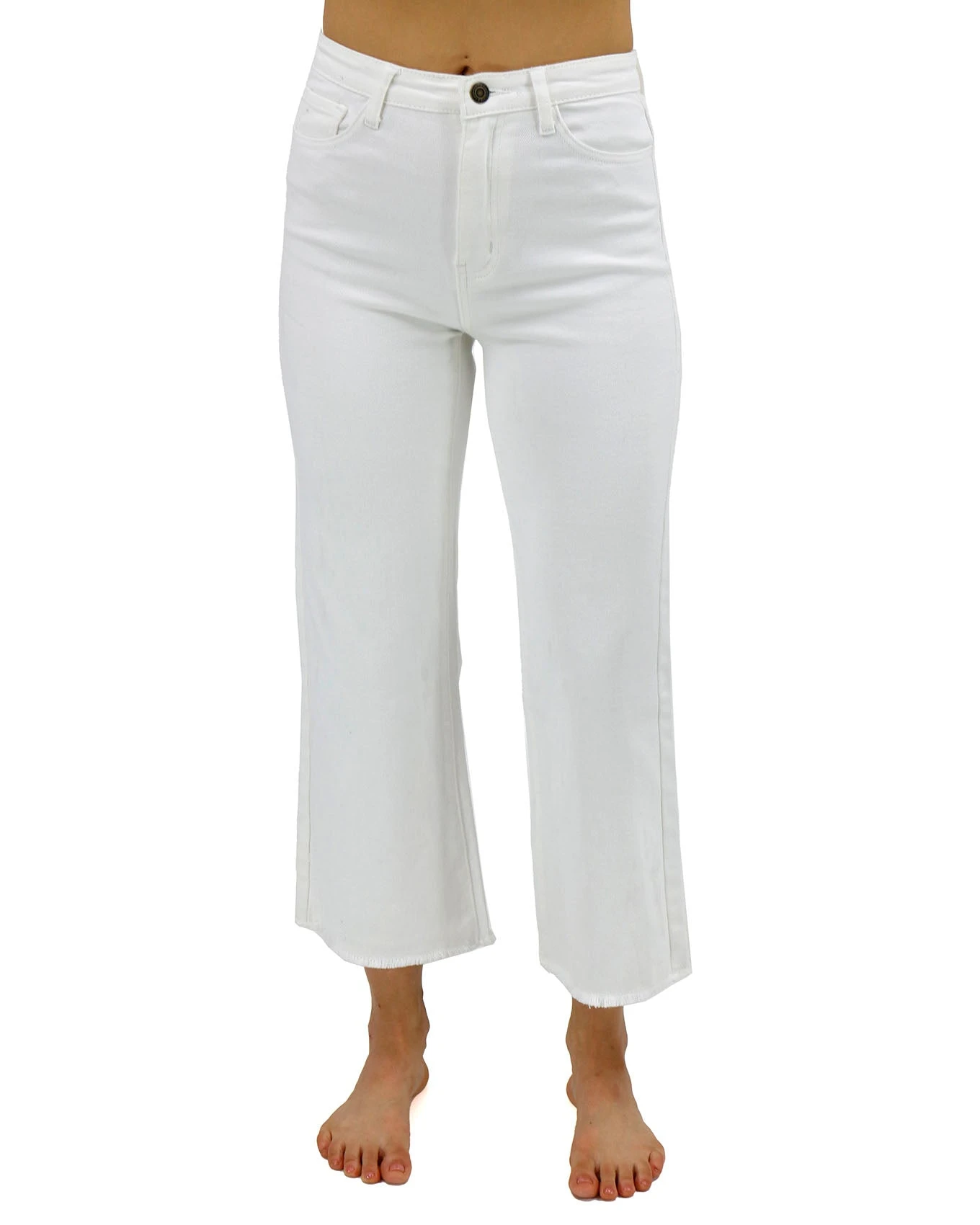 - Flattering high rise white cropped wide leg jeans with frayed hem