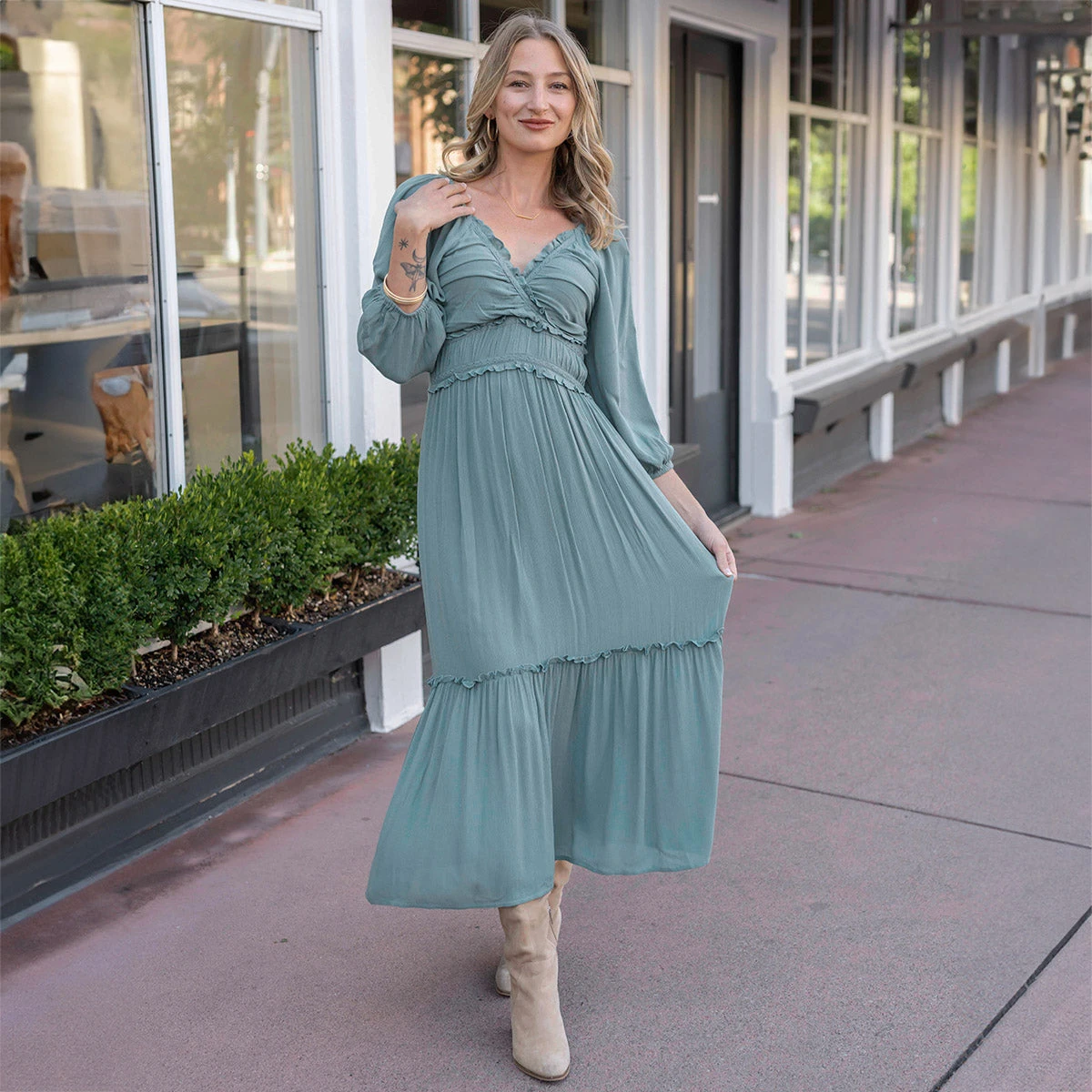 Get your carts ready – introducing this season’s newest show stopper, the Destination Maxi Dress! This gorgeous tiered maxi dress is dripping with romantic details we know you’ll love – flattering v neckline, right-on-trend ruching, and a sweet, subtle tiered hemline. Whether your destination is a quick weekend getaway, brunch at a bistro on vacay, or even a wedding or special event, you’ll love this timeless maxi dress for seasons to come!Â