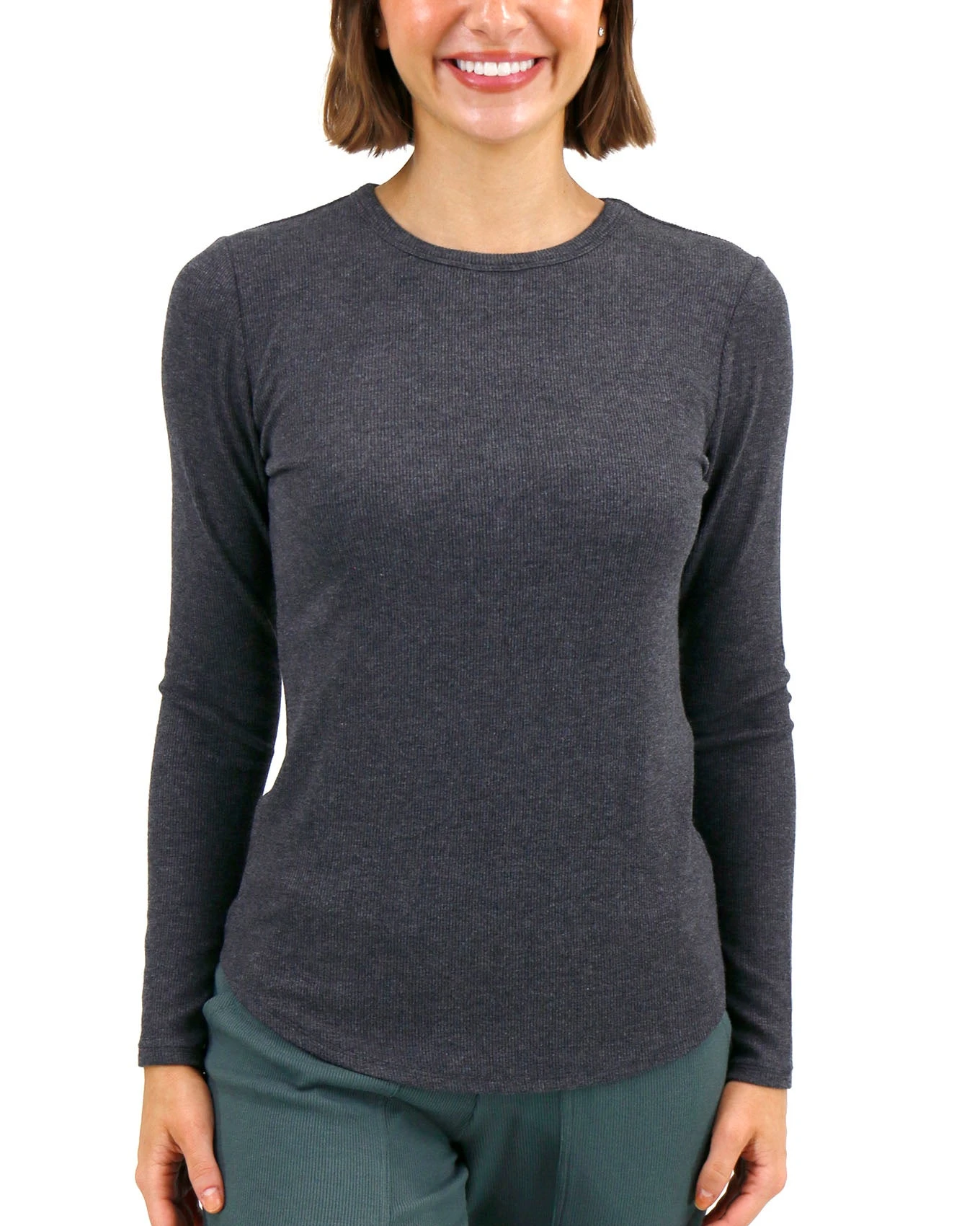 - Slim fit, long sleeve, crew neck, ribbed tee in charcoal