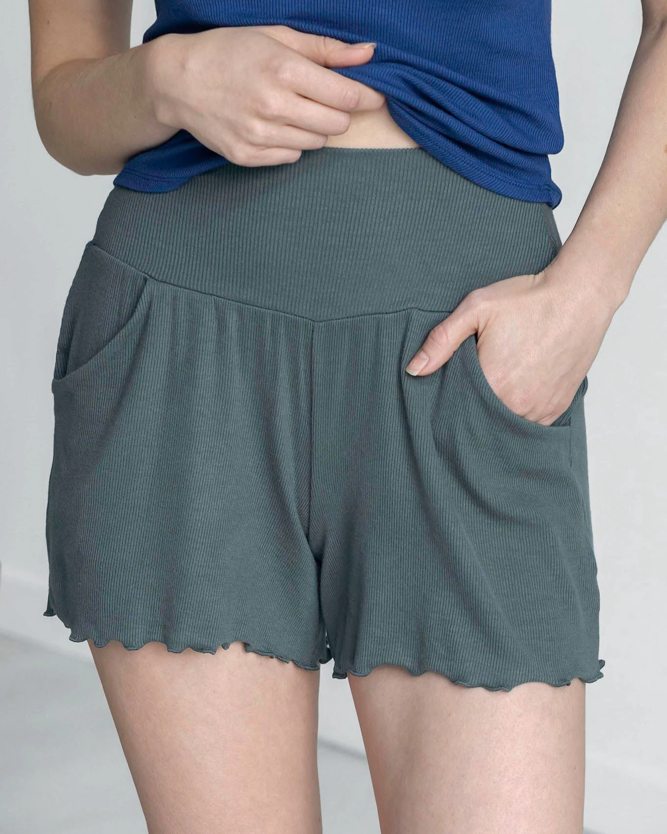 - Relaxed fit, forest green, casual rib knit shorts with lettuce hem detail and functional side and rear pockets
