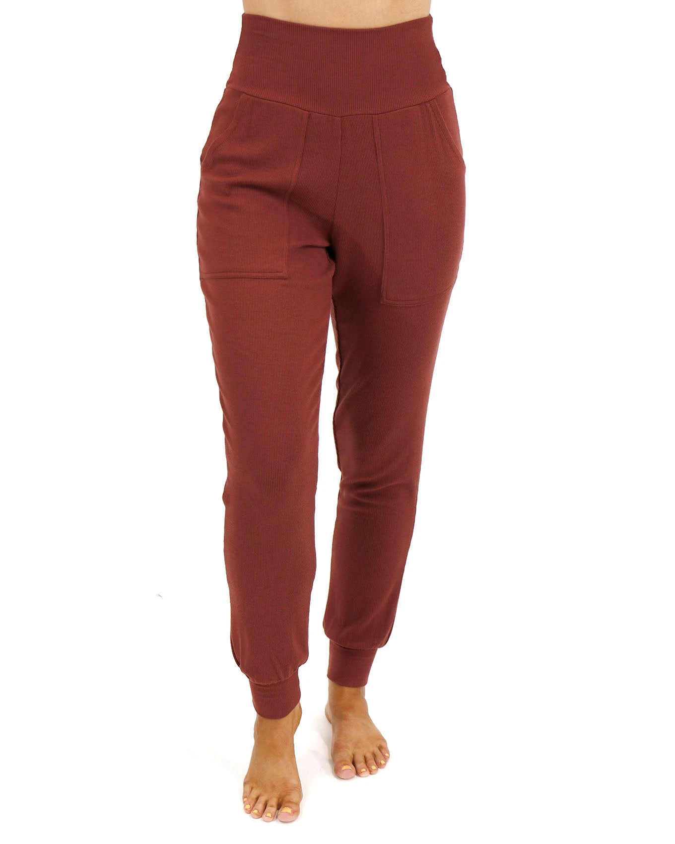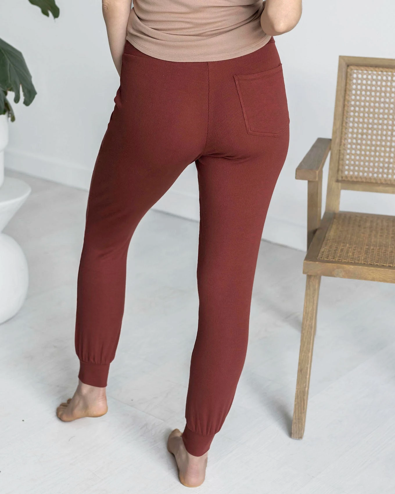 - Relaxed fit, casual rib knit jogger pants in rust with functional front pockets