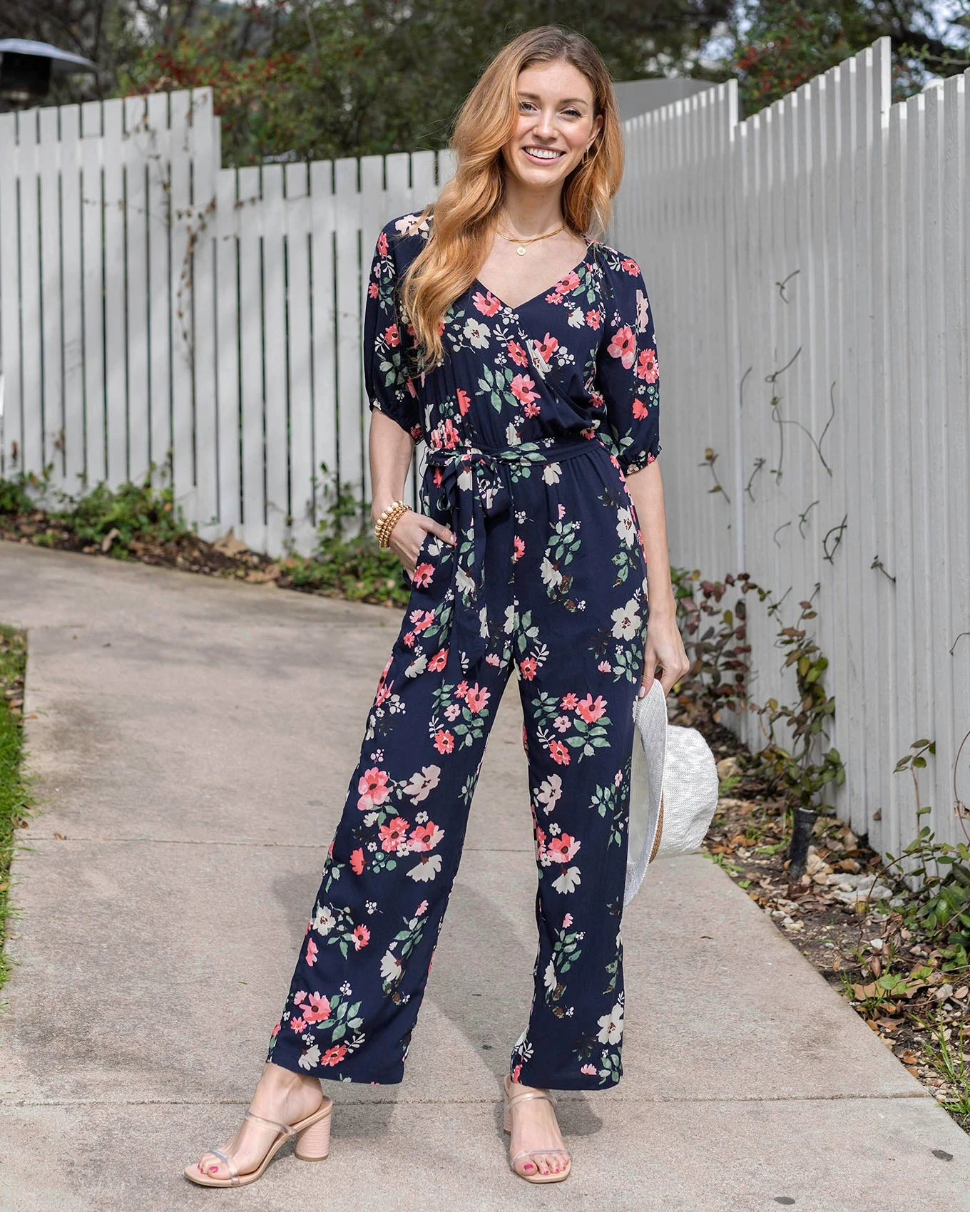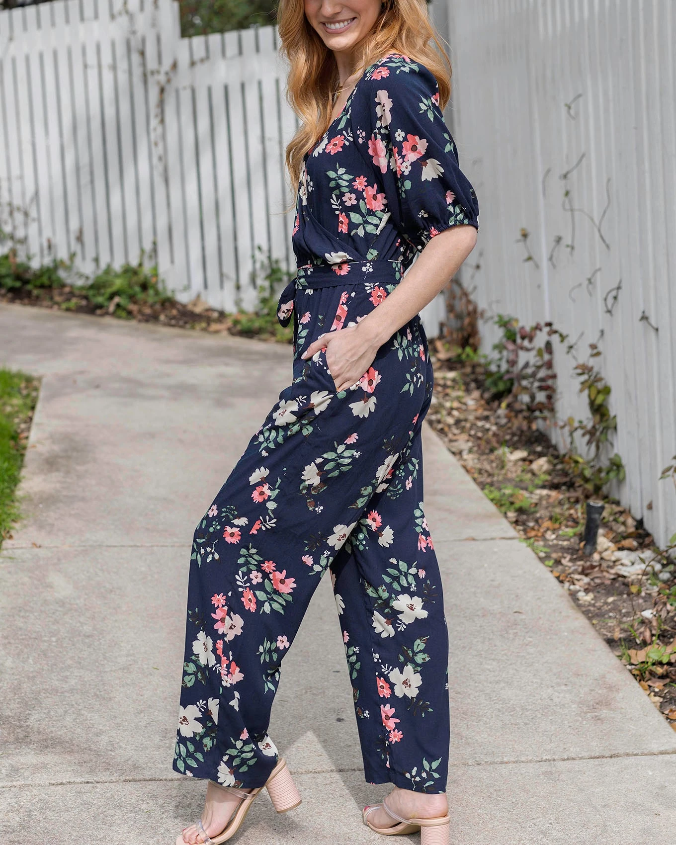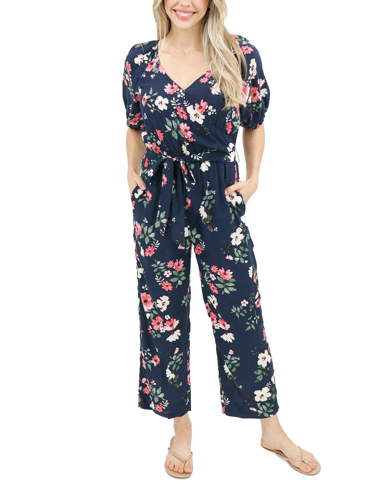 - Straight leg navy floral jumpsuit with easy-on surplice body and pockets