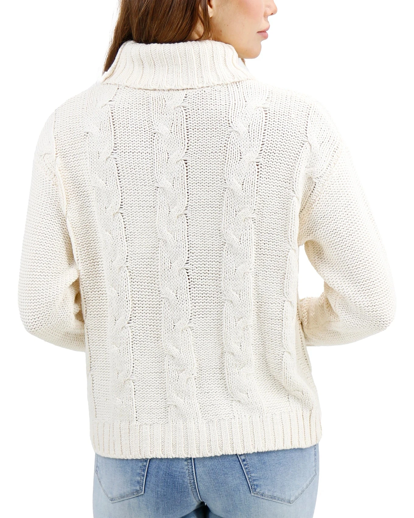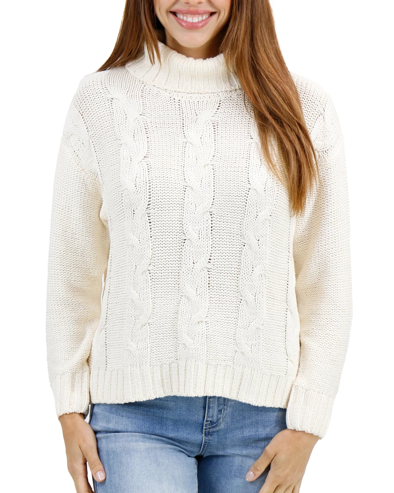 - Classic turtleneck cable knit sweater in timeless ivory