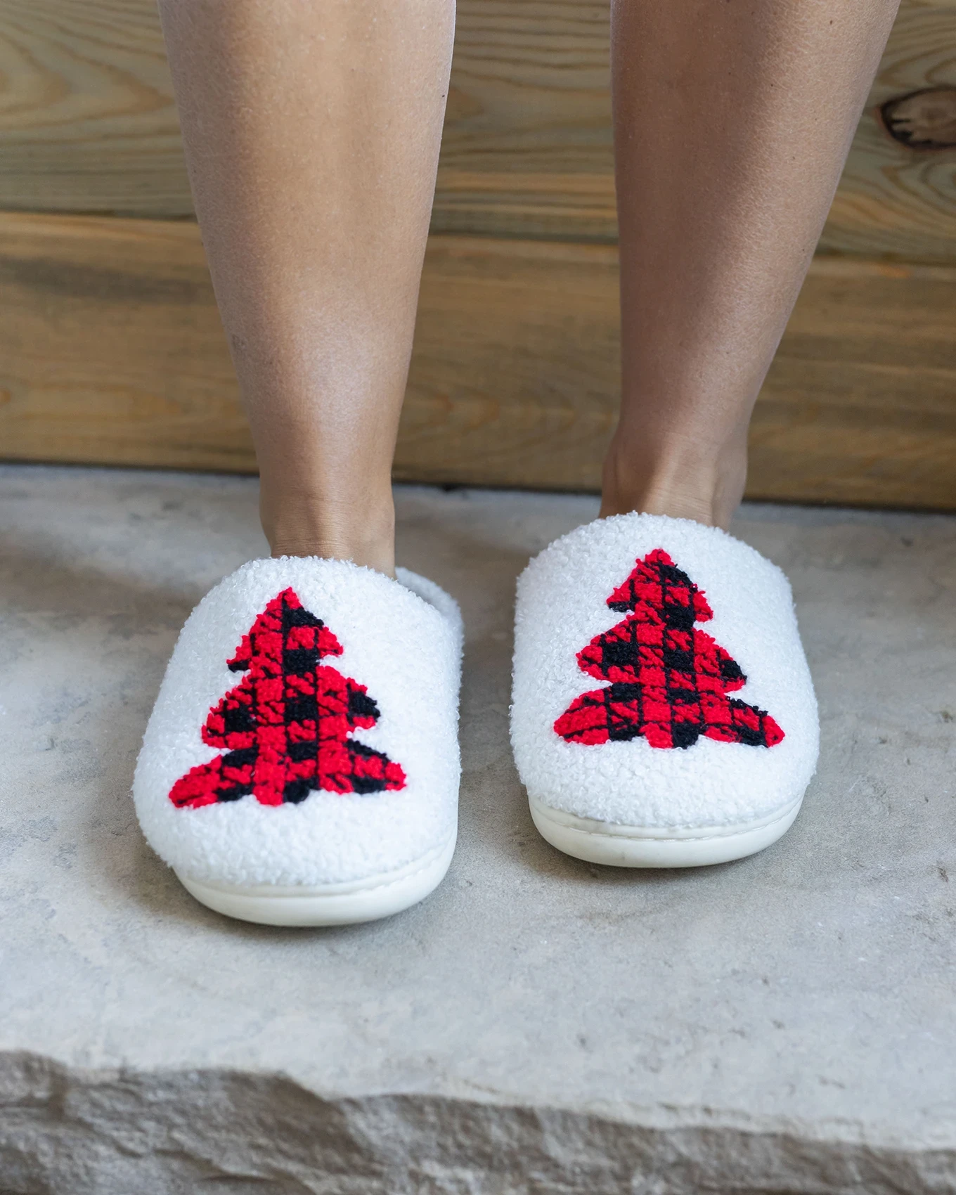 - Plush holiday sherpa slippers with red plaid Christmas tree design