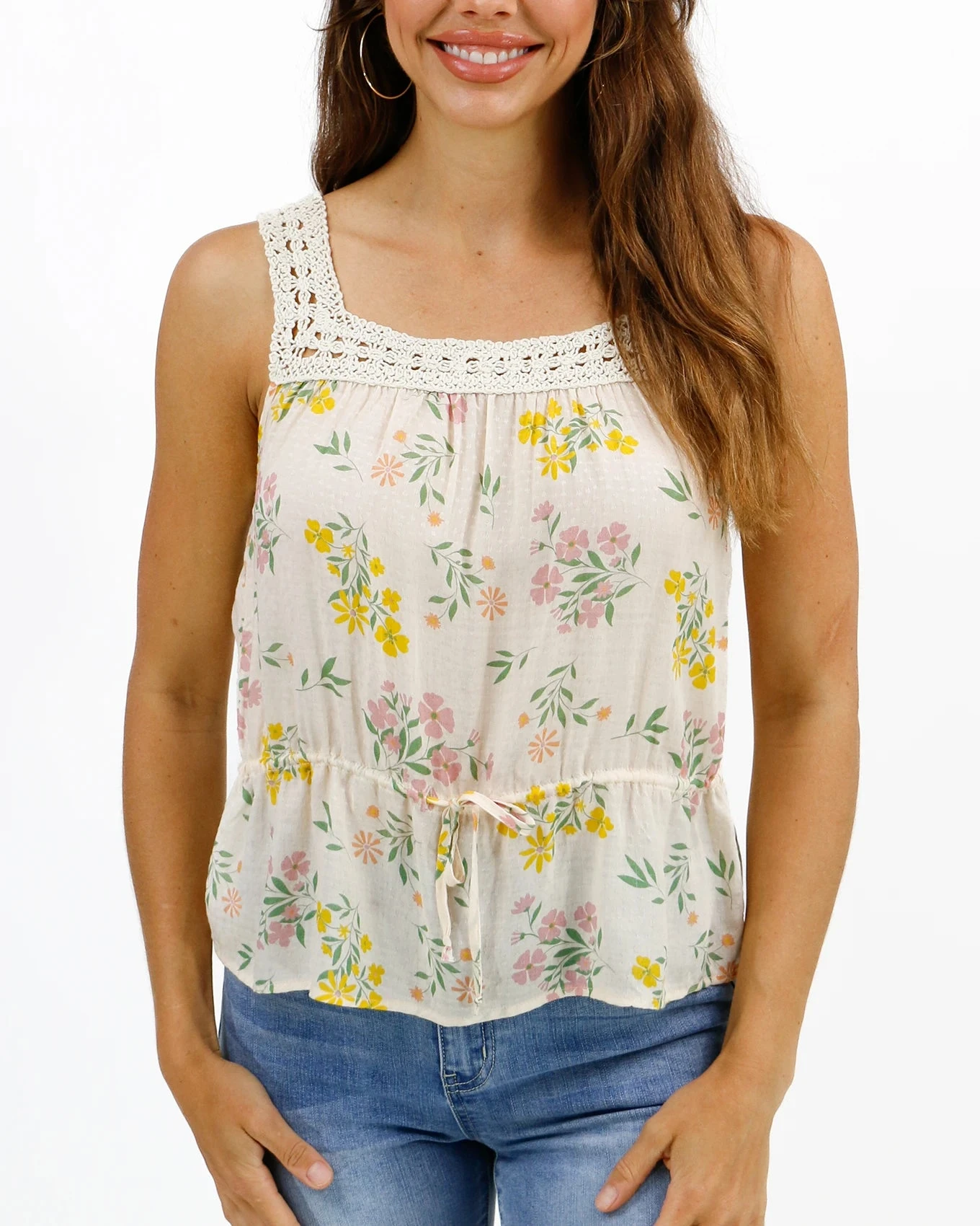 Fashion tank top with square neck crochet trim. Woven, textured material with custom floral print and functional waist seam tie. Fabric does not have stretch, but in general is a loose and flowy fit. Between sizes can size down.