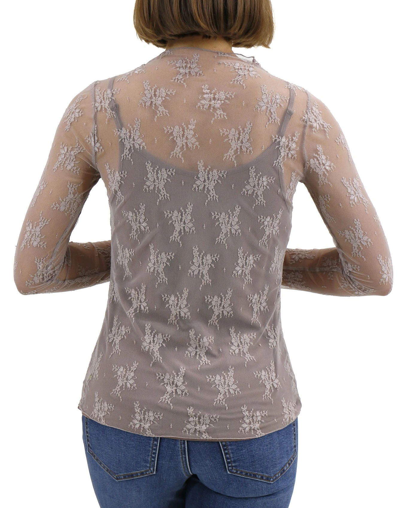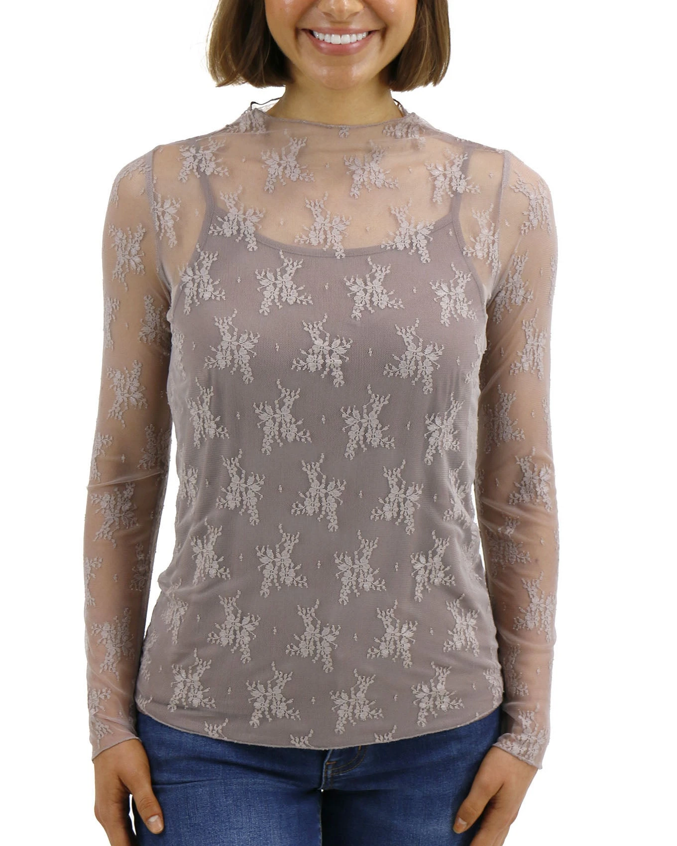 - Long sleeved taupe stretch lace top with funnel mock neck