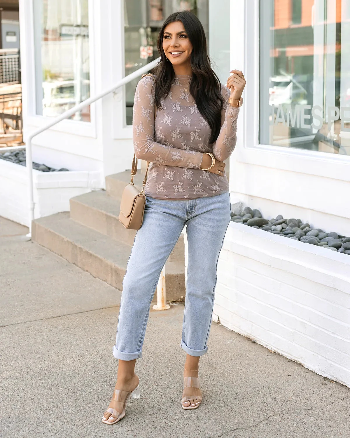Elegant and elevated! Transform your look with the all new Taupe Lace Mesh Top—a delicate blend of sophistication and style. The top of the trends with our G&L touches, this stretch lace top features soft, itch-free mesh to keep you comfortable all day long. Perfect for layering, this sheer beauty pairs seamlessly over a cami or under your favorite jacket for a chic, on-trend look.