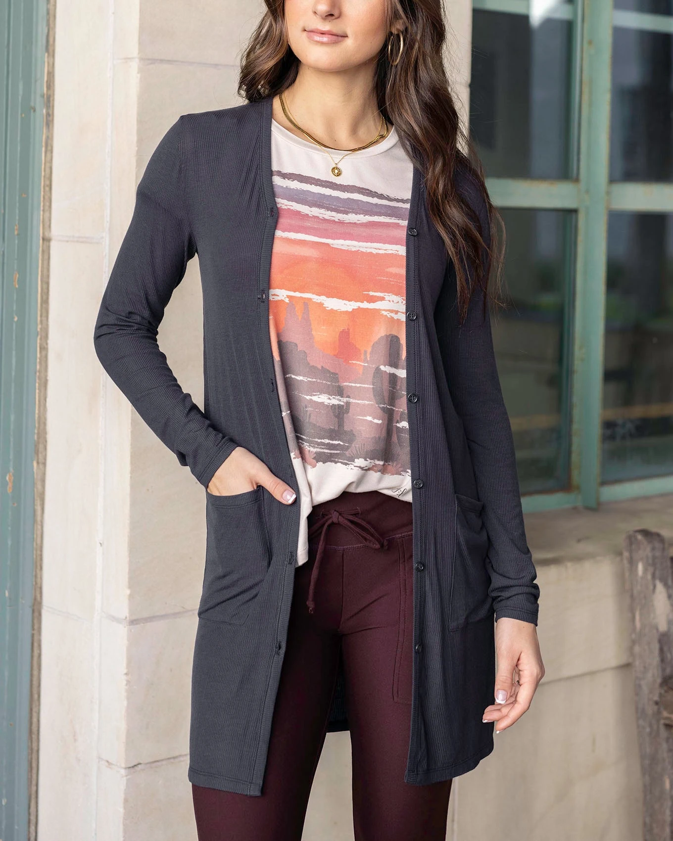 Your favorite duster length cardigan is back in a new shorter length for spring! Meet the new Lightweight Ribbed Cardigan! With its new versatile length and same incredible soft and slinky feel, this long sleeved button up cardigan is sure to be your new layering favorite this spring and beyond!