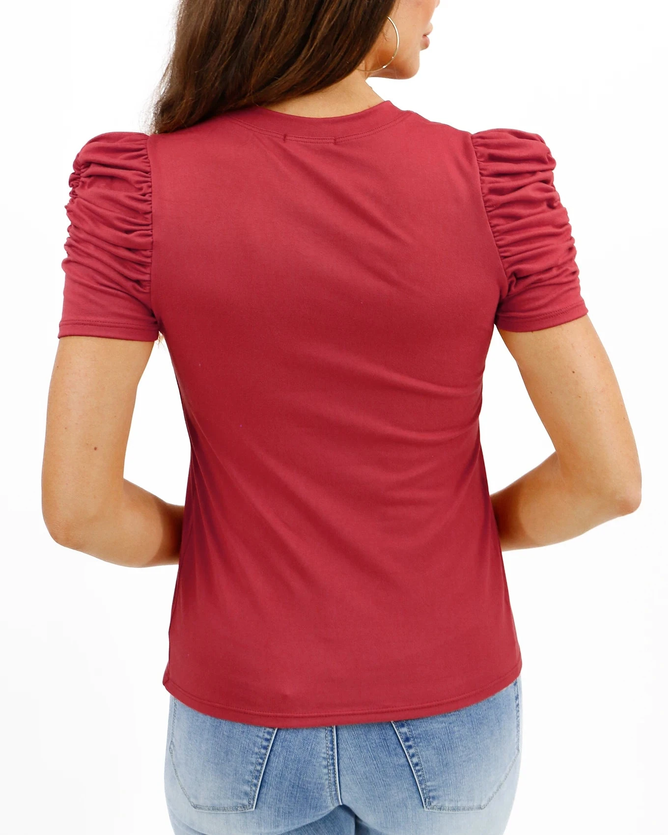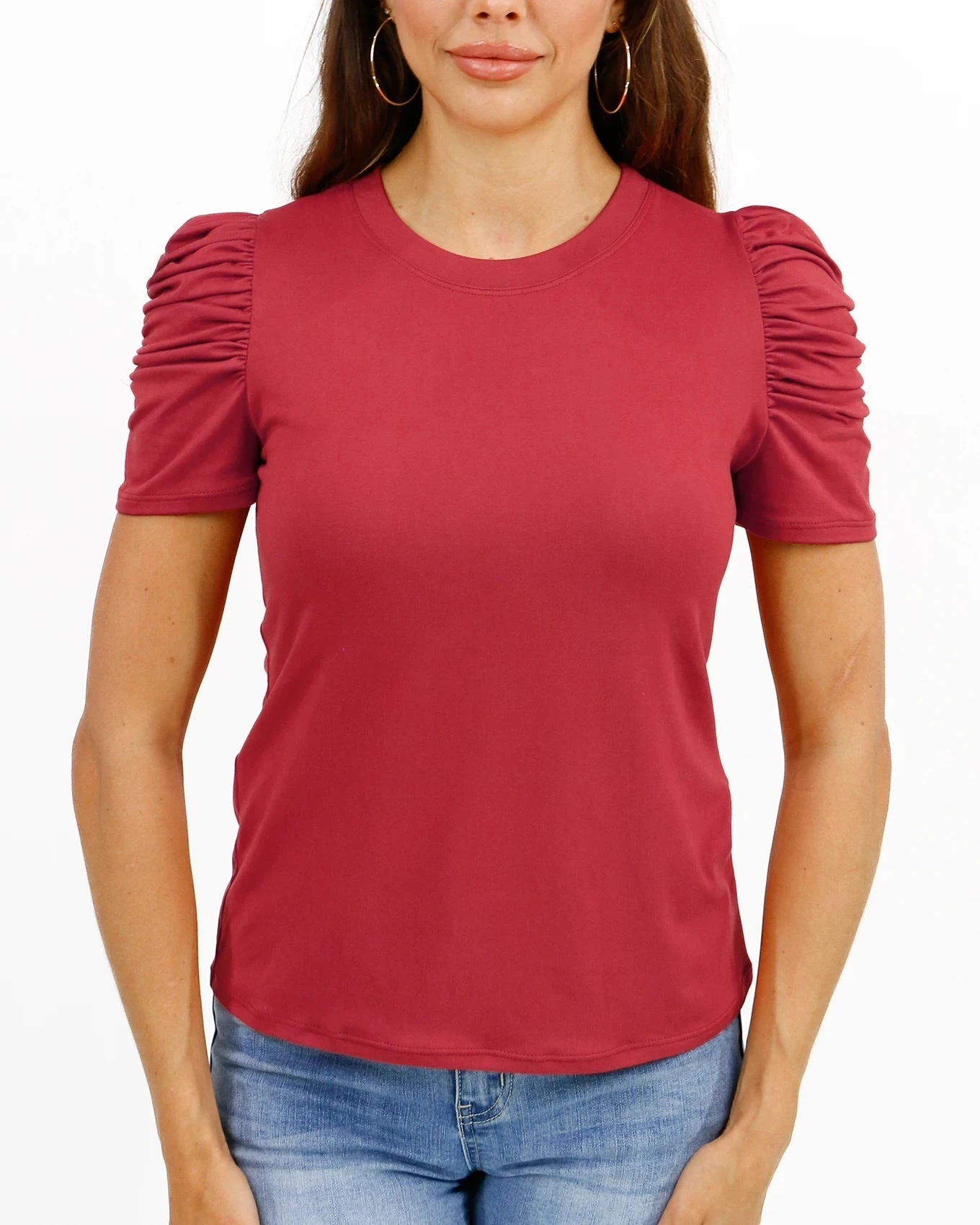 - Short sleeve, ruched sleeve top in red hued Desert Clay, made from our signature Live-In fabric with a peached, brushed feel