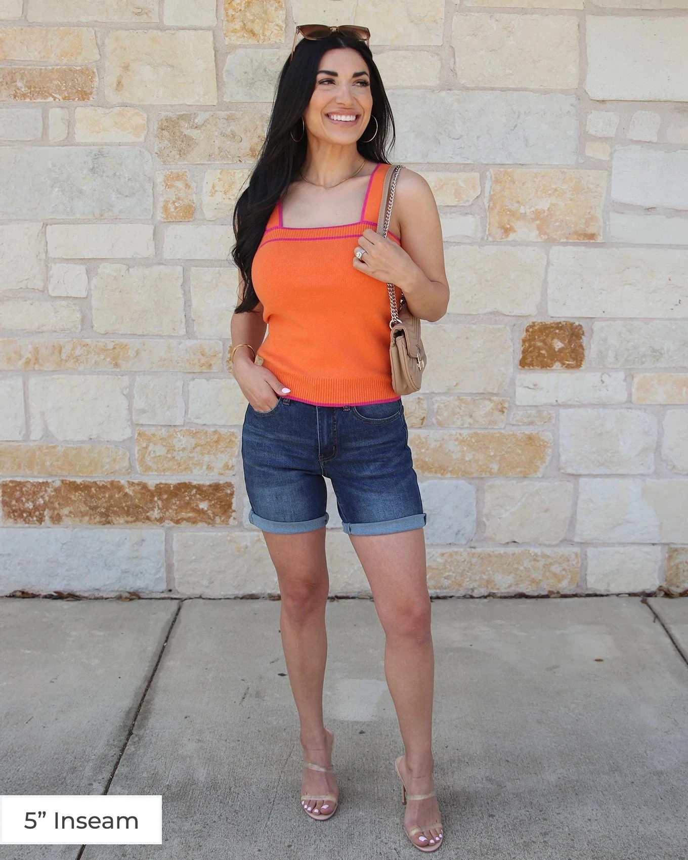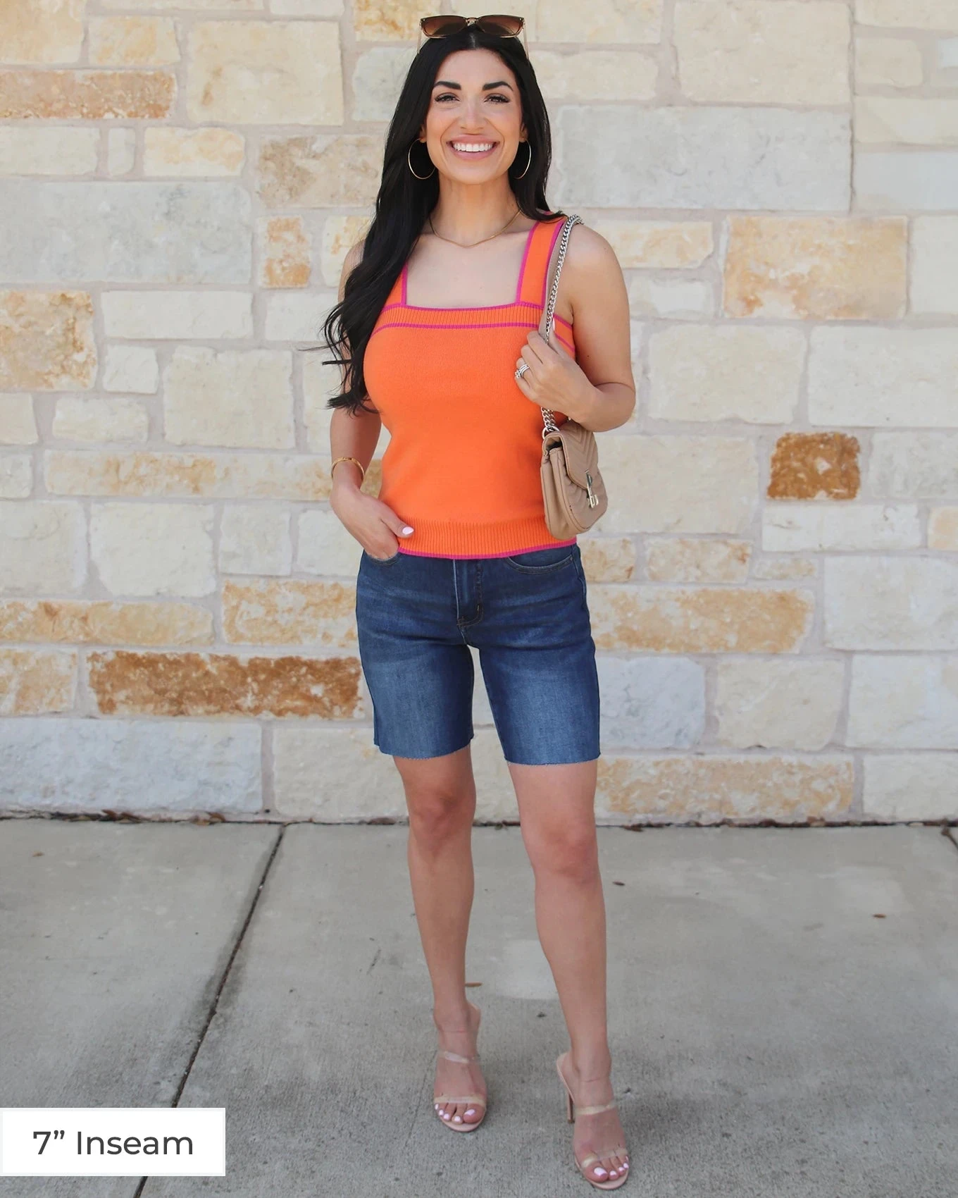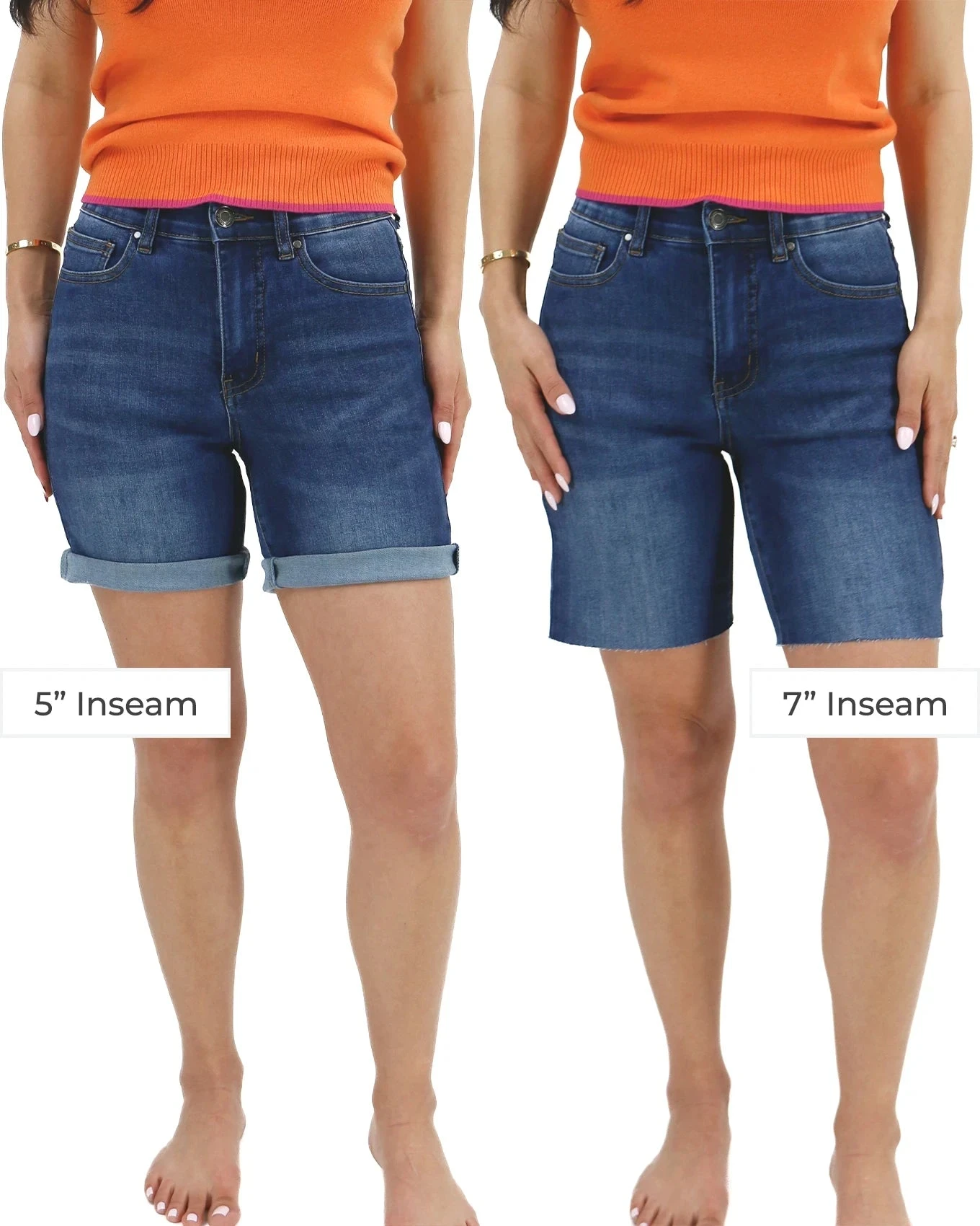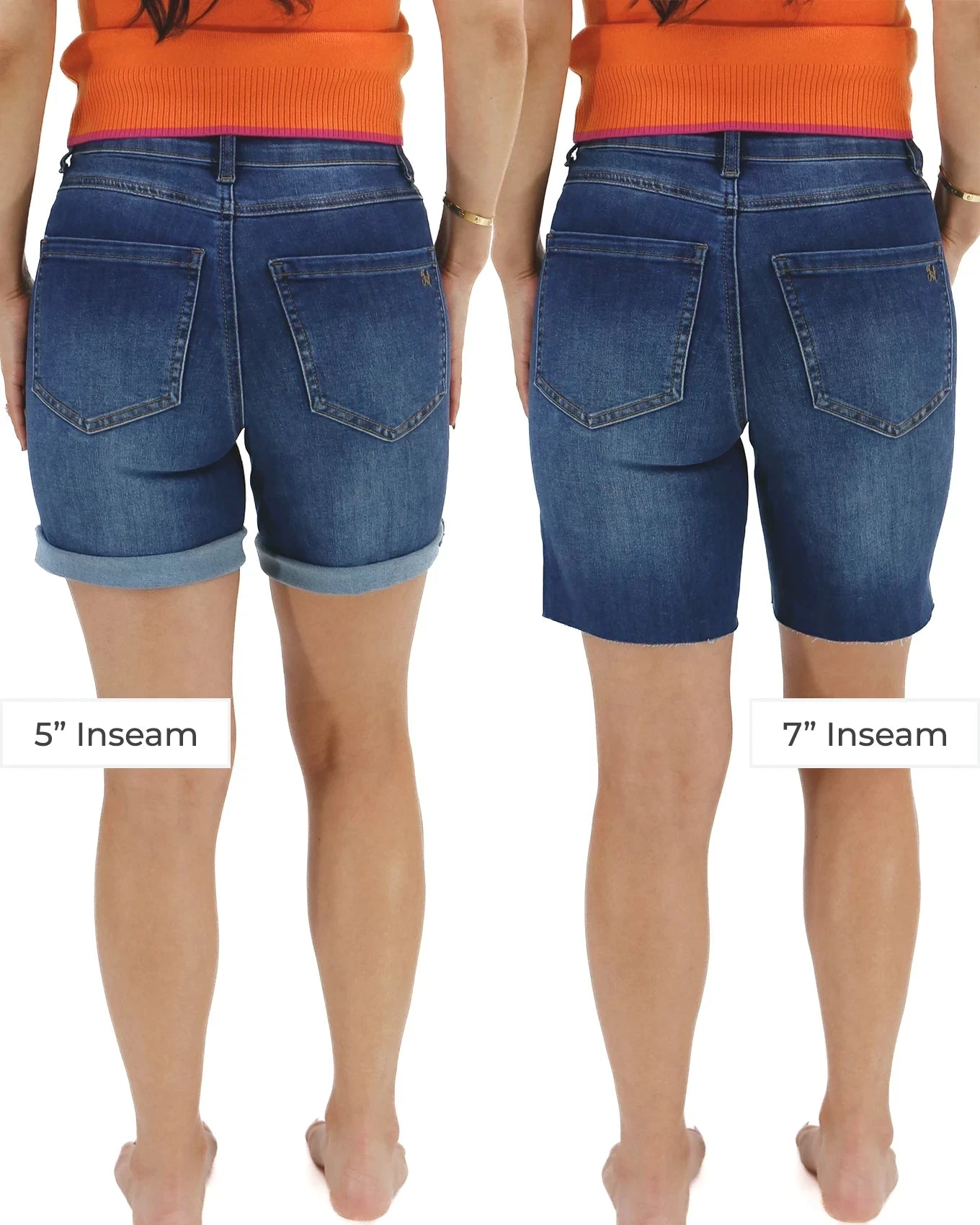 - Stretchy raw cut edge 7 inch inseam high waisted jean shorts (6 or 5 inch if cuffed or double cuffed) in classic medium dark wash