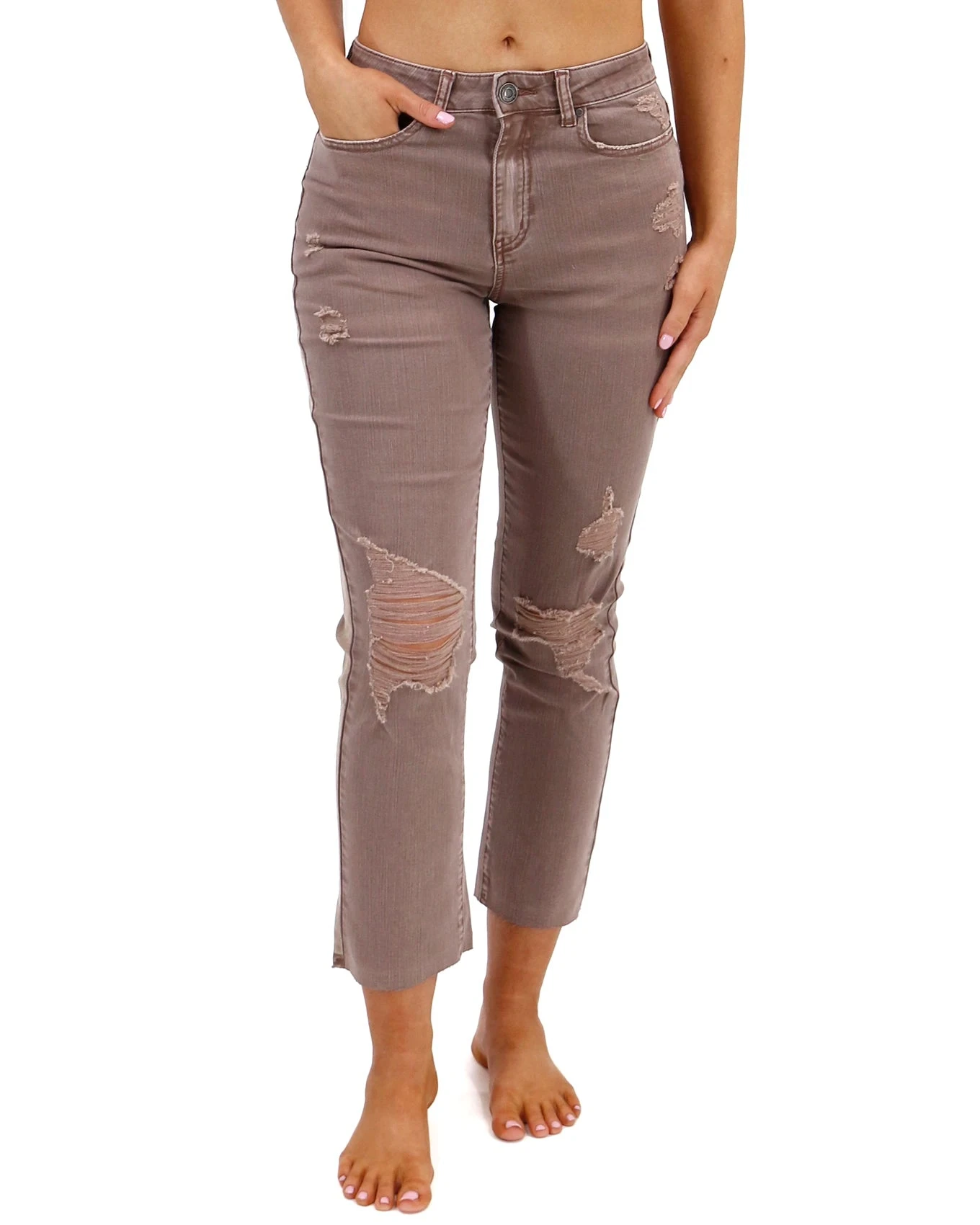 - Cropped straight leg denim jean in a dusty muted vintage wine