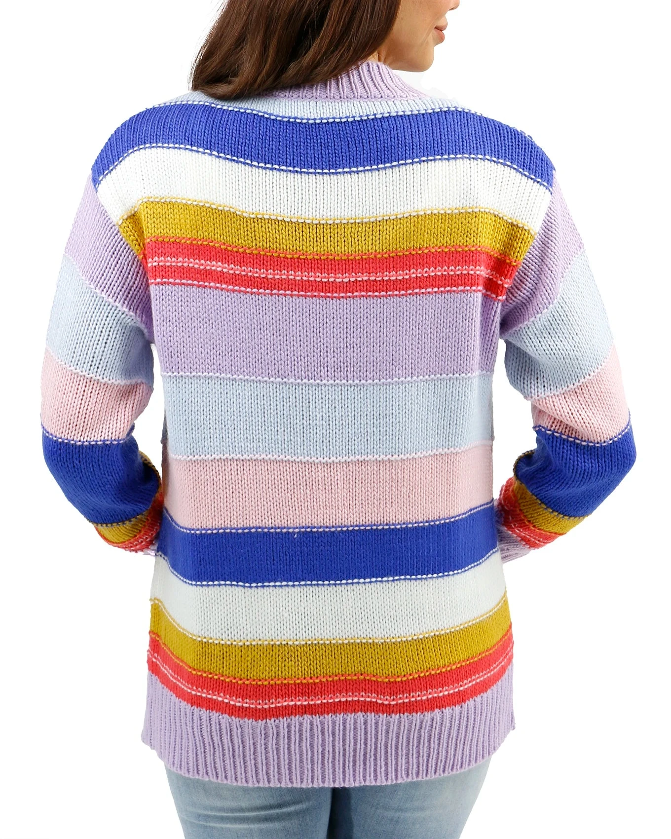 - Functional pockets with ribbed hem detail and looped color knit stitch detail between the colorful stripes