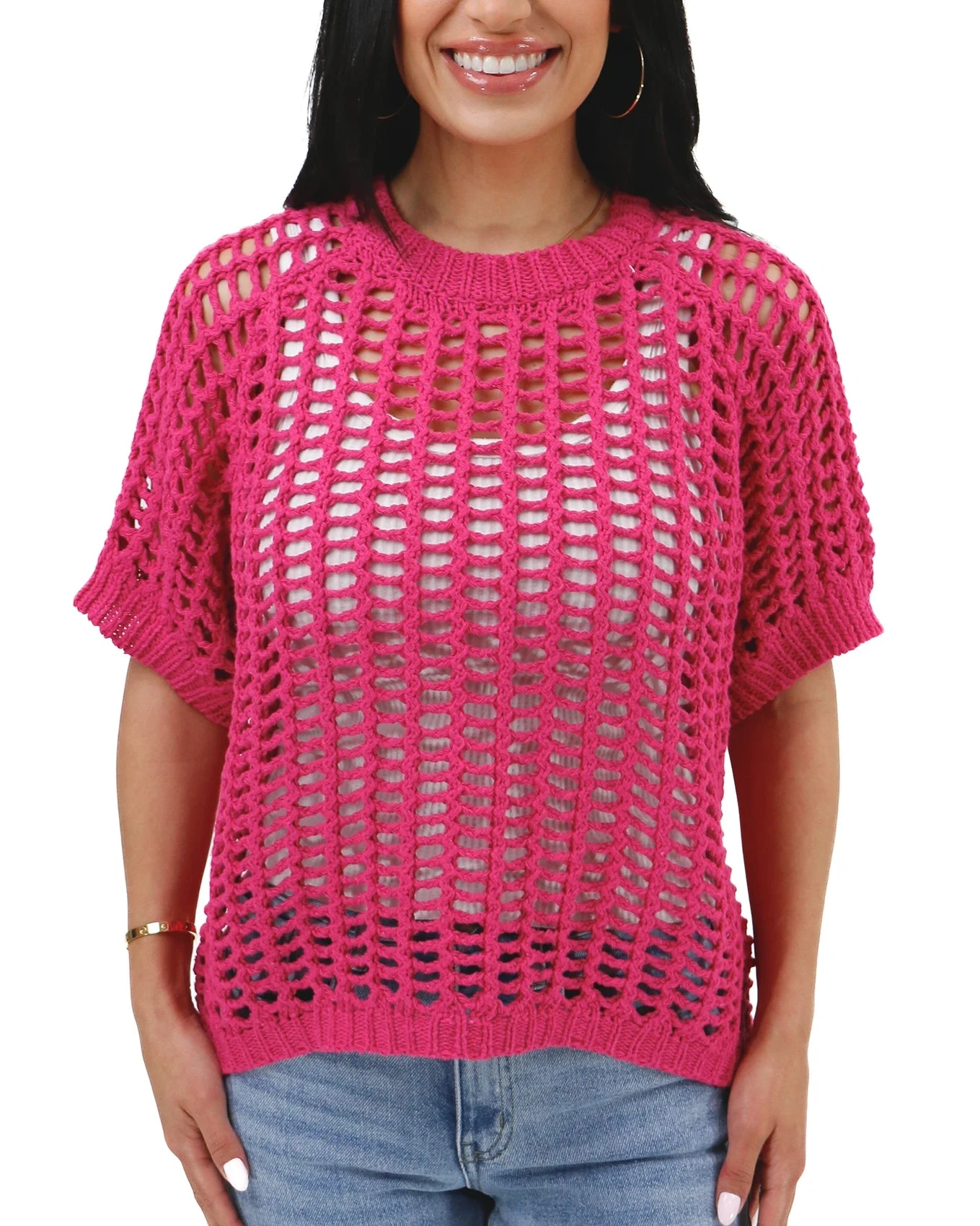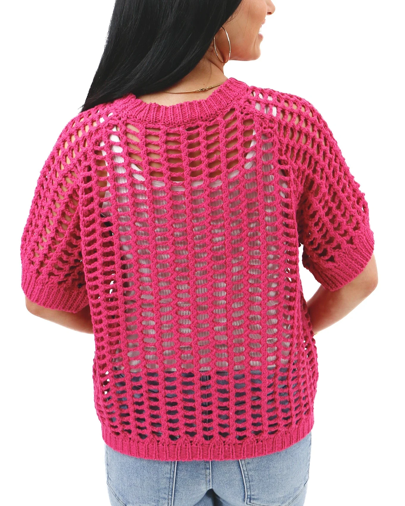 - Short sleeve, crew neck, open knit sweater in hot pink