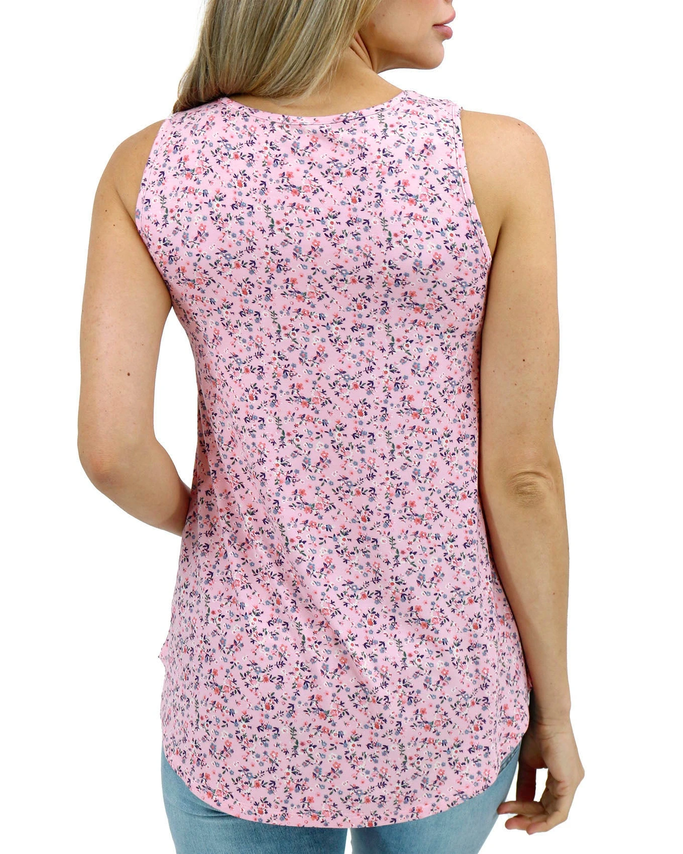 - Flattering scoop neck tank top with signature front pocket detail in pink mini floral print