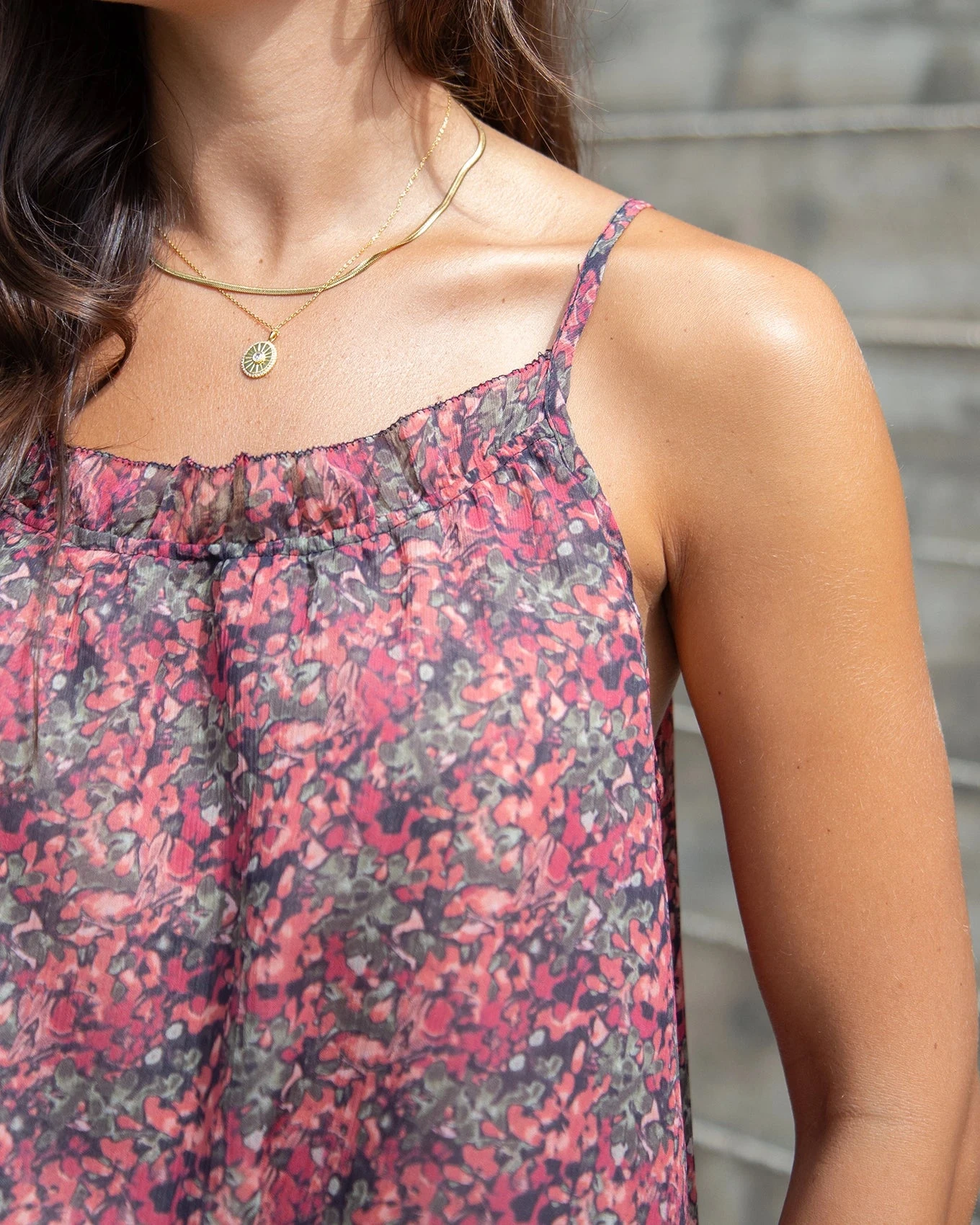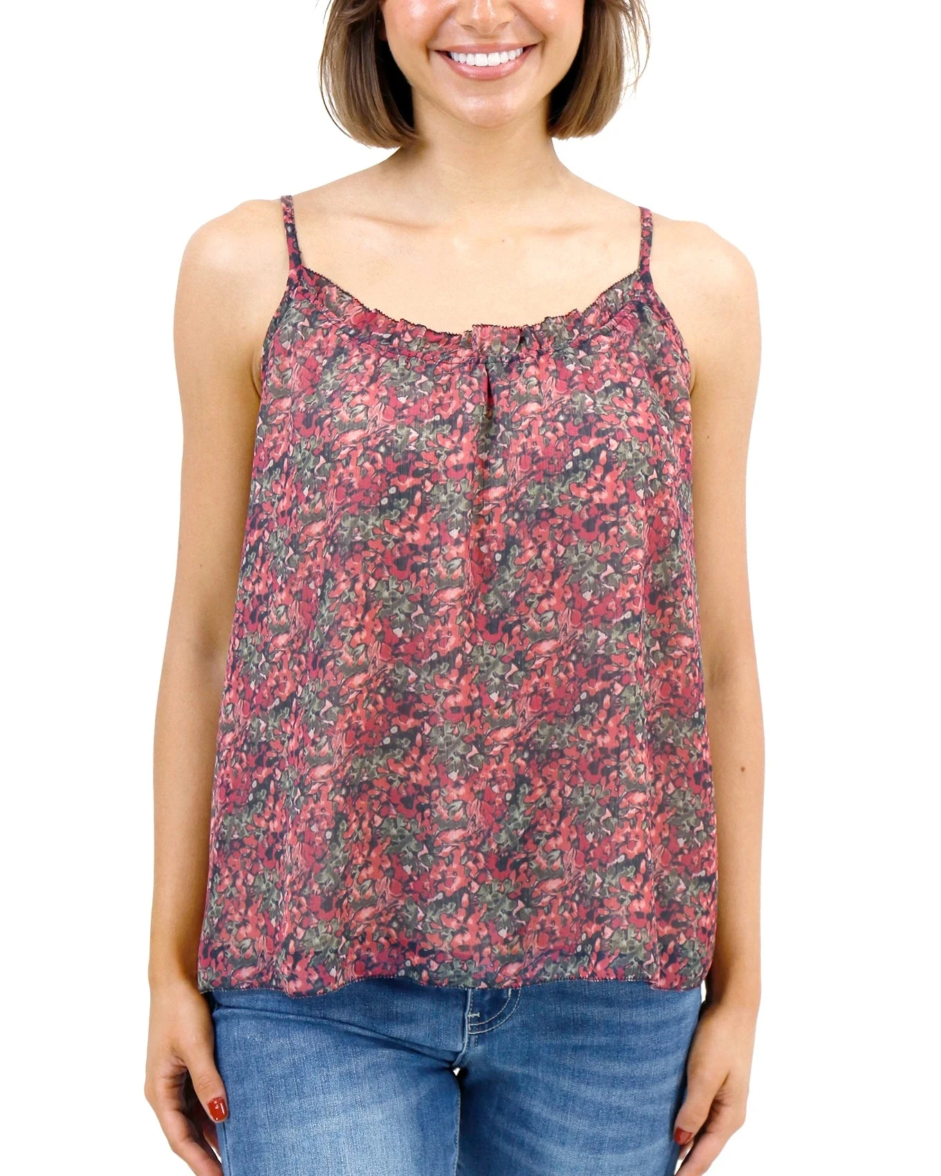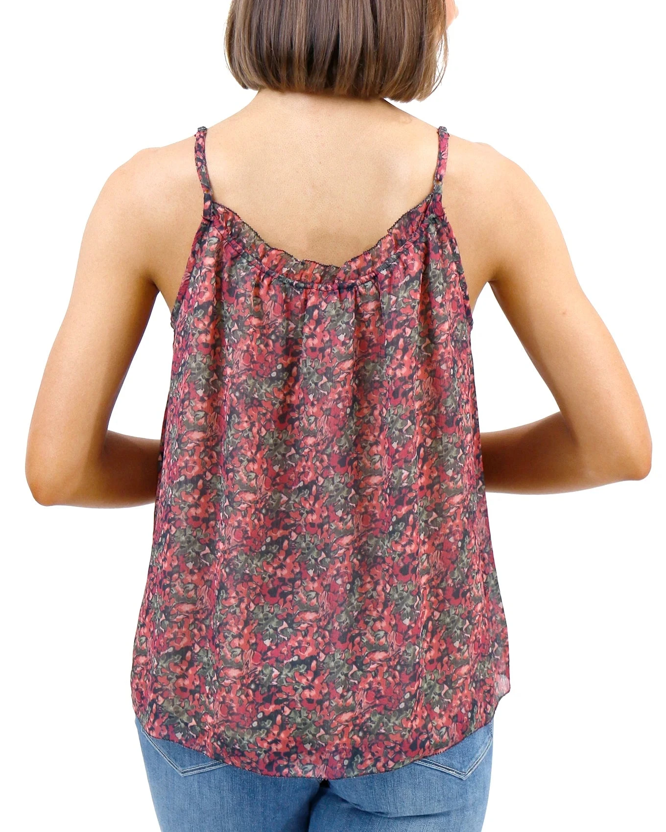 - Flowy spaghetti strap red floral cami top with feminine, swingy silhouetteÂ