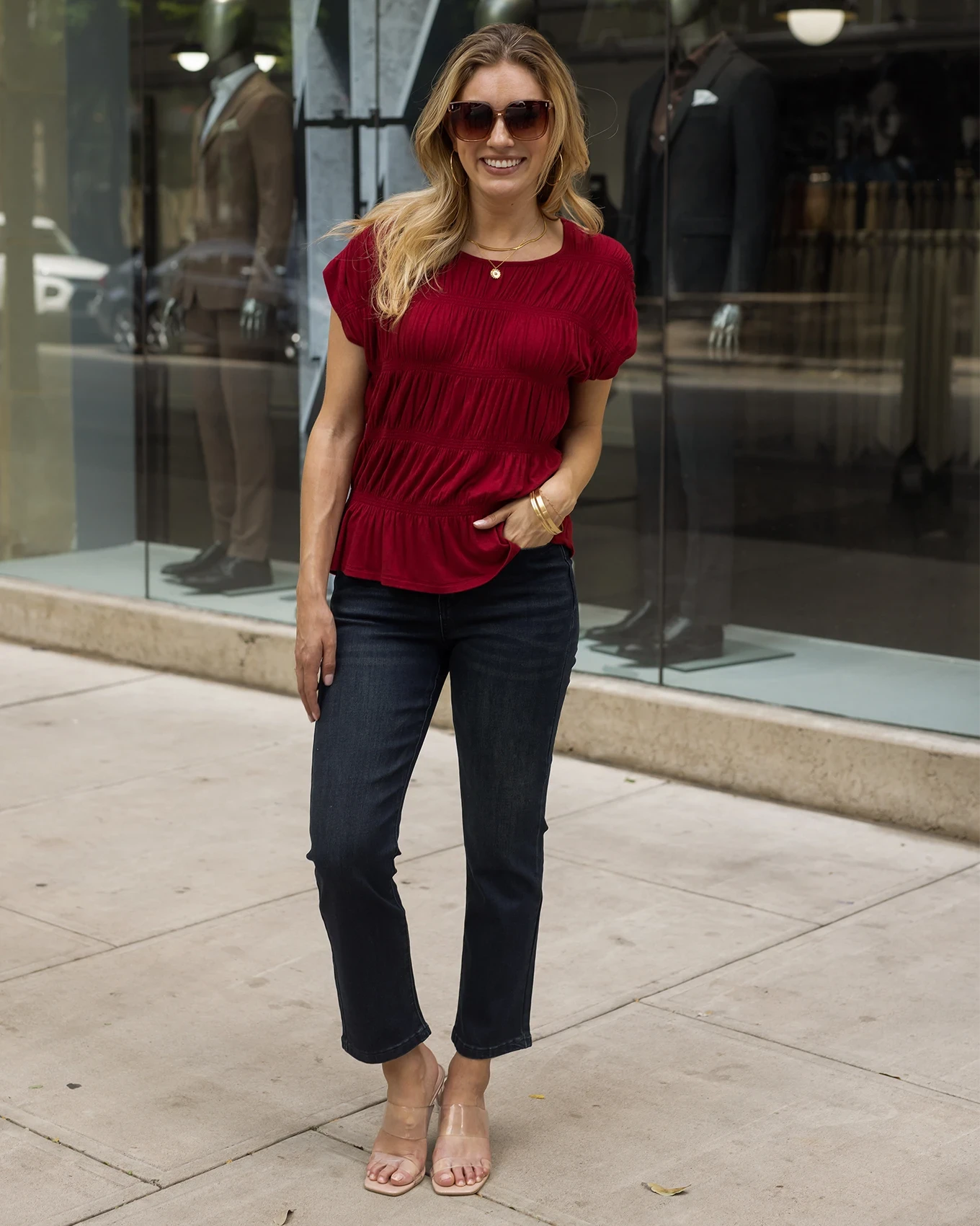 Everyday chic! The new Shirred Smocked Top transforms your daily style without any extra effort, giving you an elevated basic top with the feel of your favorite tee! This dolman style top in eye-catching perfect red blends feminine flutter sleeves into the comfortable, flowy bodice for an ultra flattering fit you’ll love. Gentle smocking and shirring gives this dressy top a pop of texture and personality, while keeping it versatile enough to style for date night, a day at the office, casual with cropped denim, and more. This easy, elevated top proves that getting ready for the day doesn’t have to be hard!