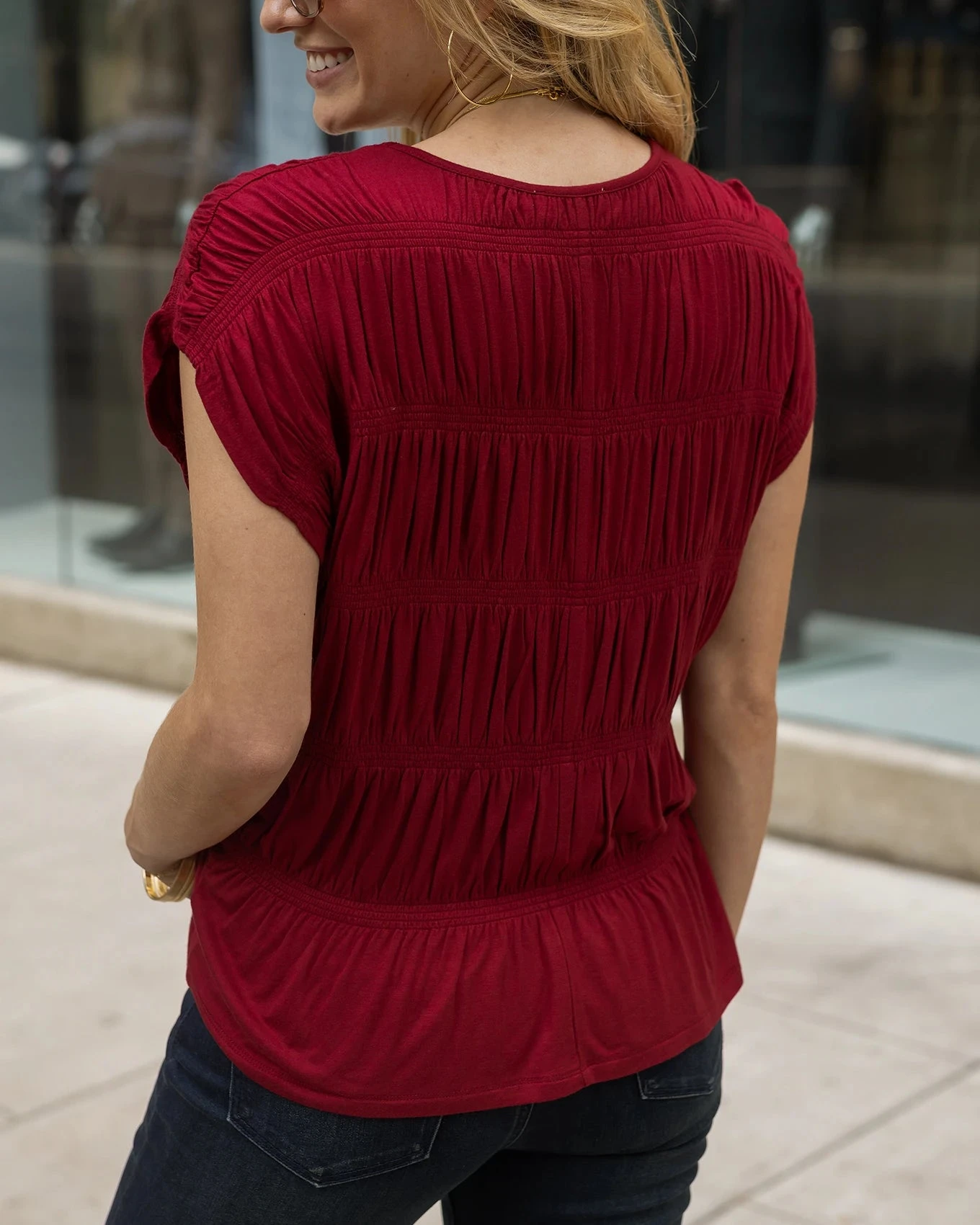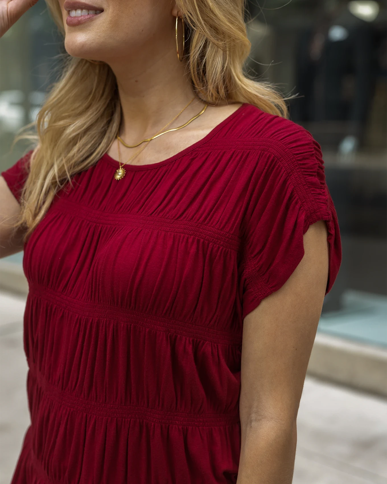 - Flowy, drapey, dolman style, short sleeved, smocked top in perfect red