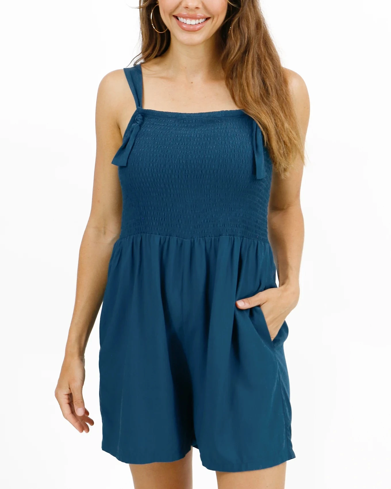 Your closet’s newest secret weapon! Introducing the new Shorts Smocked Romper! With a relaxed fit, stretchy, smocked bodice, and adjustable tie straps, this deep teal one-piece wonder is designed for all-day wear and endless possibilities. Side seam pockets add practicality without sacrificing style, while the wider leg fit keeps you comfortable whether you’re on the go or lounging at home. From beachside strolls to backyard BBQs, this shorts romper is made for soaking up every sunny moment in style!