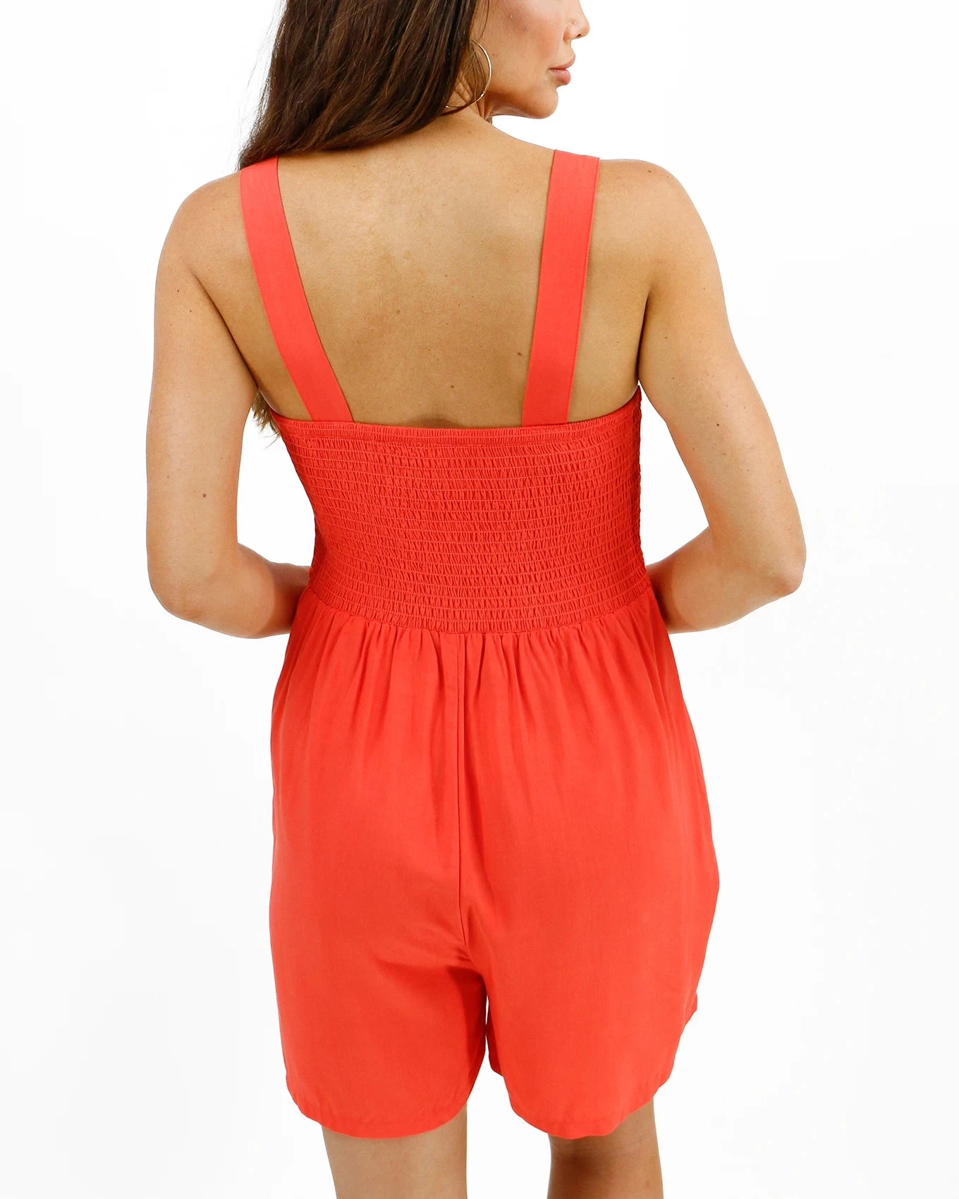 - Smocked overall shorts romper in poppy red