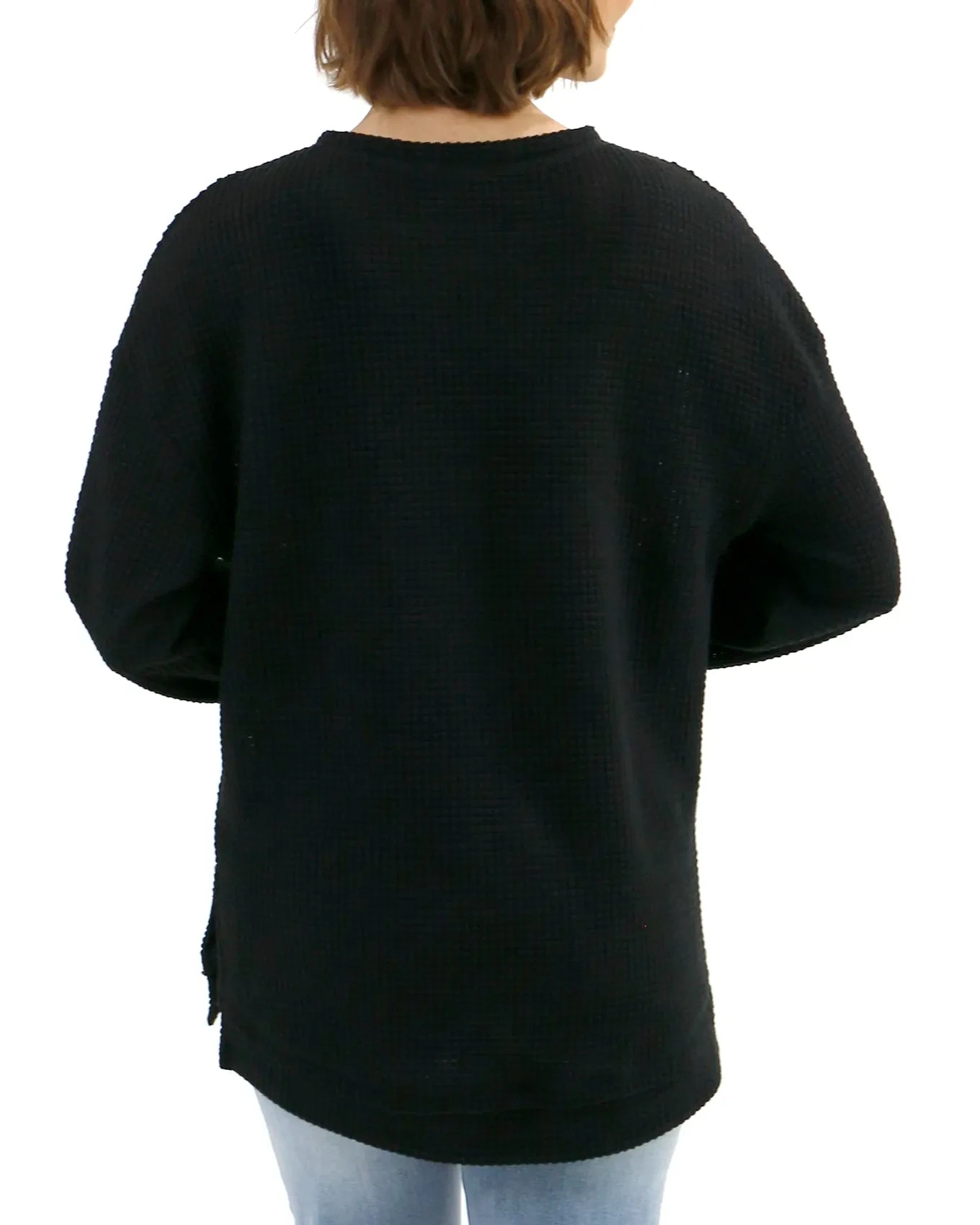 Oversized, long sleeve, waffle knit pullover with raw edge details. The knit fabric has light stretch. The fit is oversized. If between sizes, size down. Some may prefer to size down a full size.