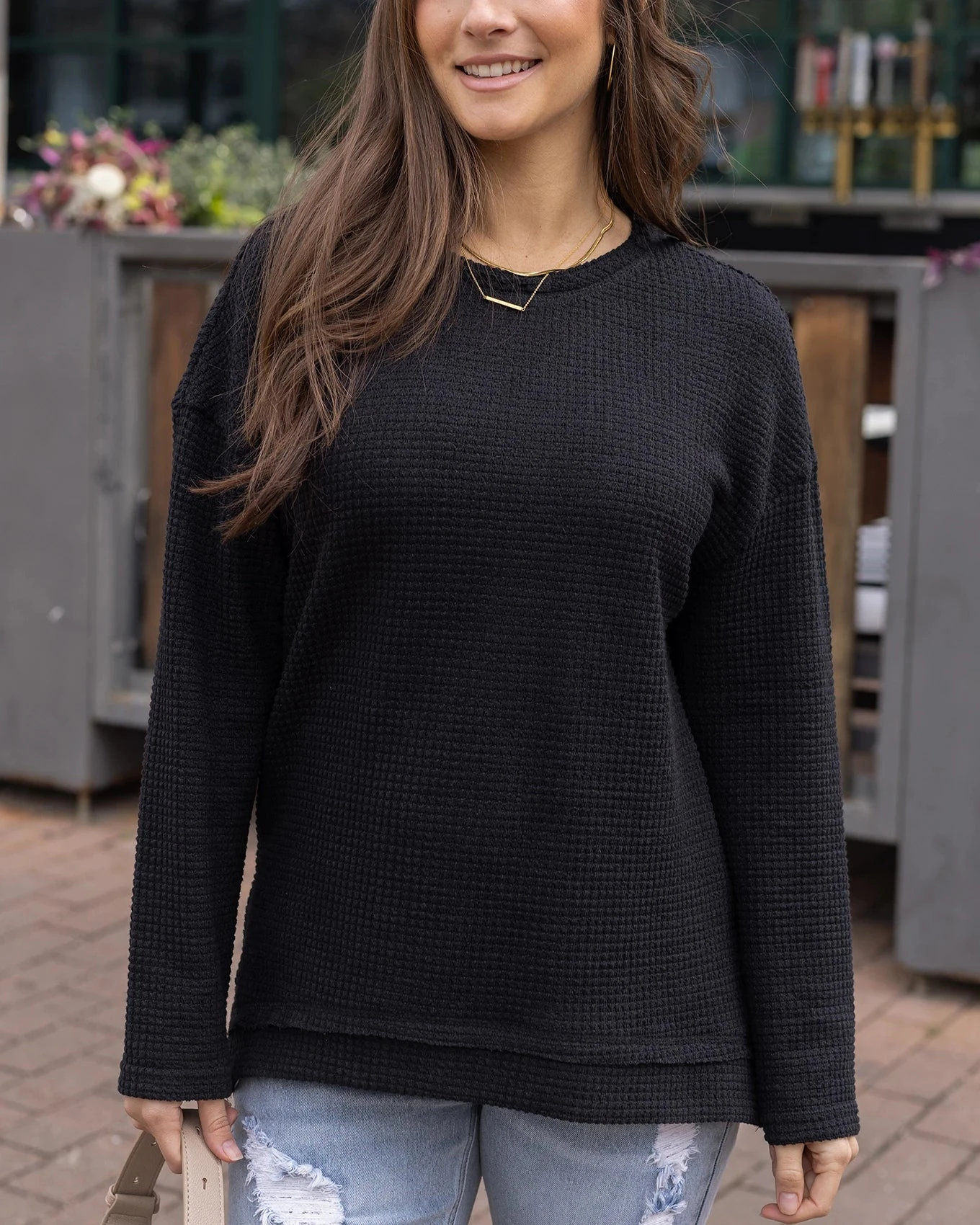 The easiest essential yet! Meet the all new Slouchy Waffle Pullover! Textured and legging friendly, this black waffle knit pullover sweater features casual design details like the scooped hemline and raw edge seams that makes it easy to pair with leggings and joggers for a laid-back style you’ll love. From dashing out the door in the mornings to curling up at home after a long day, your everyday wardrobe couldn’t be happier with this waffle knit sweater!