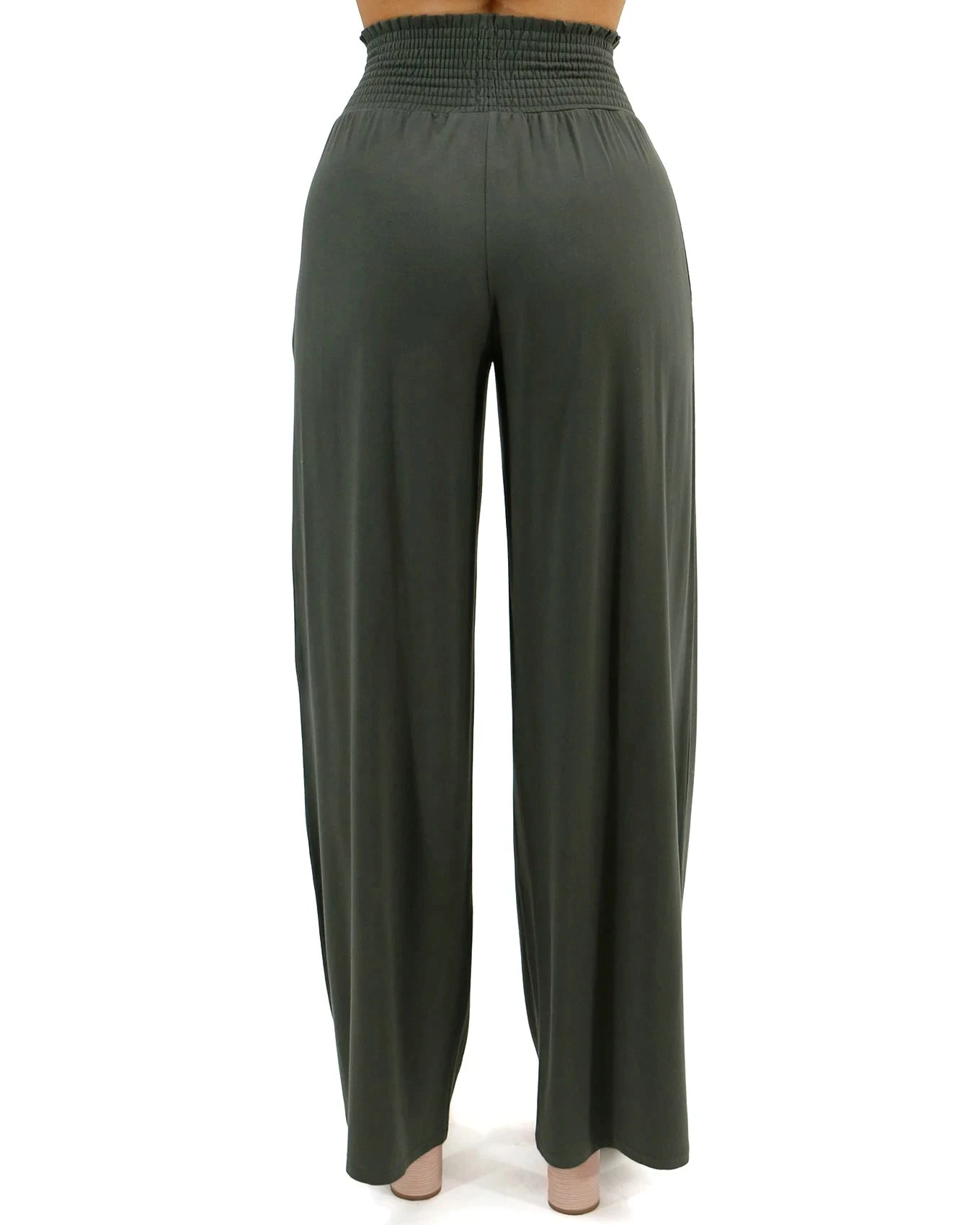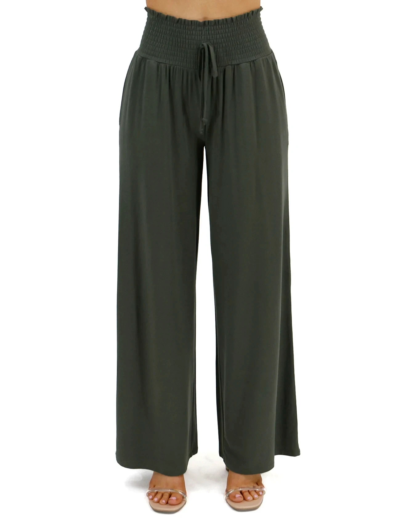 - Flowy, wide leg, lounge pants in olive green with super stretchy, smocked waistband and decorative waist tie