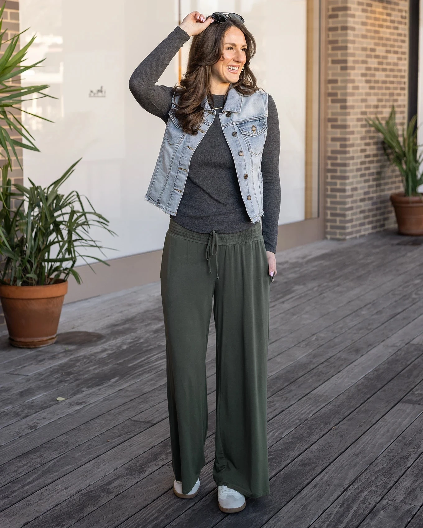The most comfortable lounge pants ever are back! We brought back your favorite Smocked Wide Leg Lounge Pants in a gorgeous olive green color that’s just right for the new season, ready to pair with tees, tanks, Bramis and more! These flowy wide leg pants feature an ultra comfy smocked waistband, can be cut to length for a custom fit, and of course have functional pockets, making these a hands down favorite you’ll love wearing whether out and about or lounging at home after a long day!