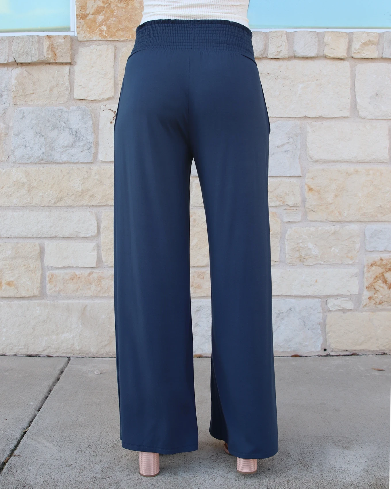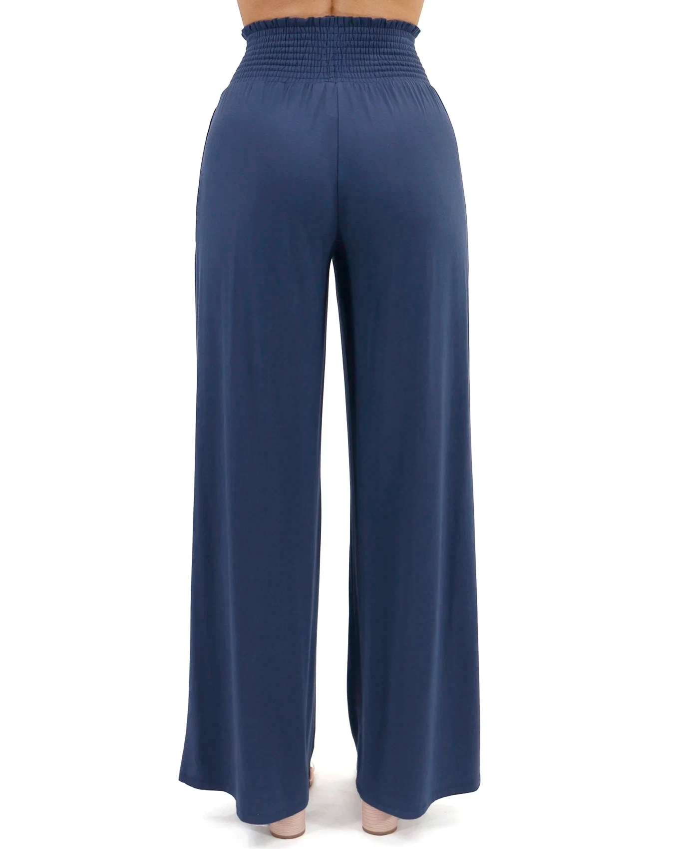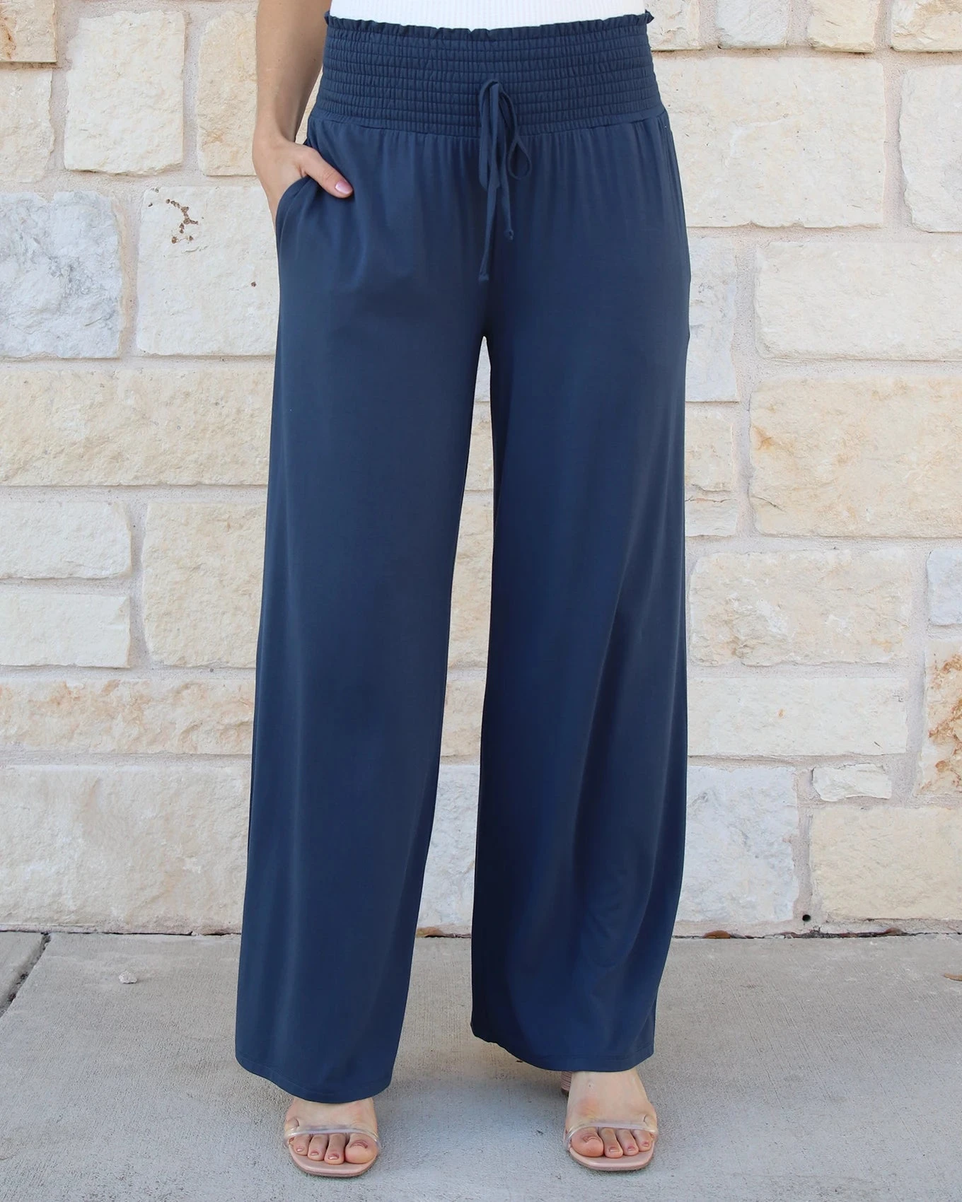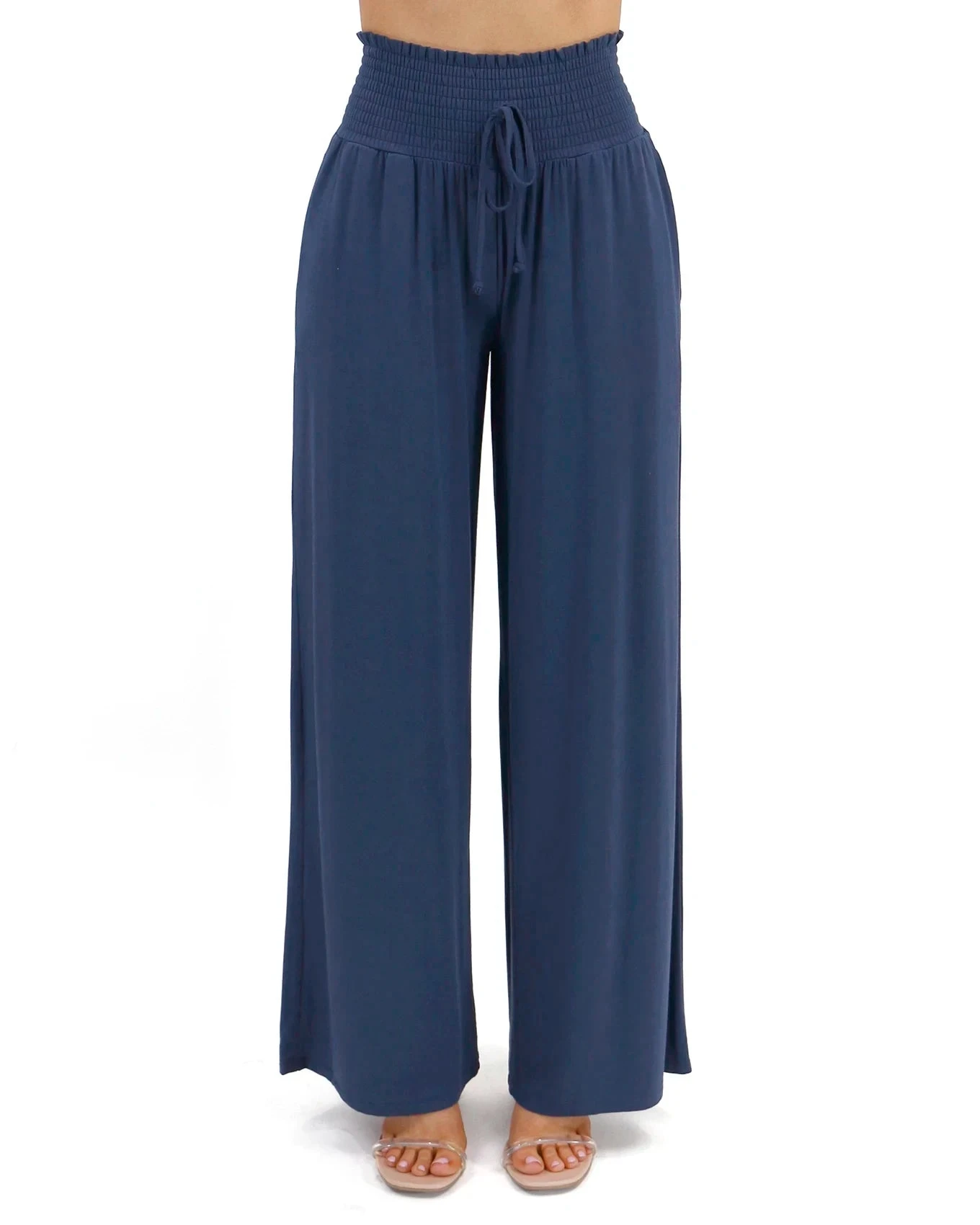 - Flowy, wide leg, lounge pants in smoke blue with super stretchy, smocked waistband and decorative waist tie
