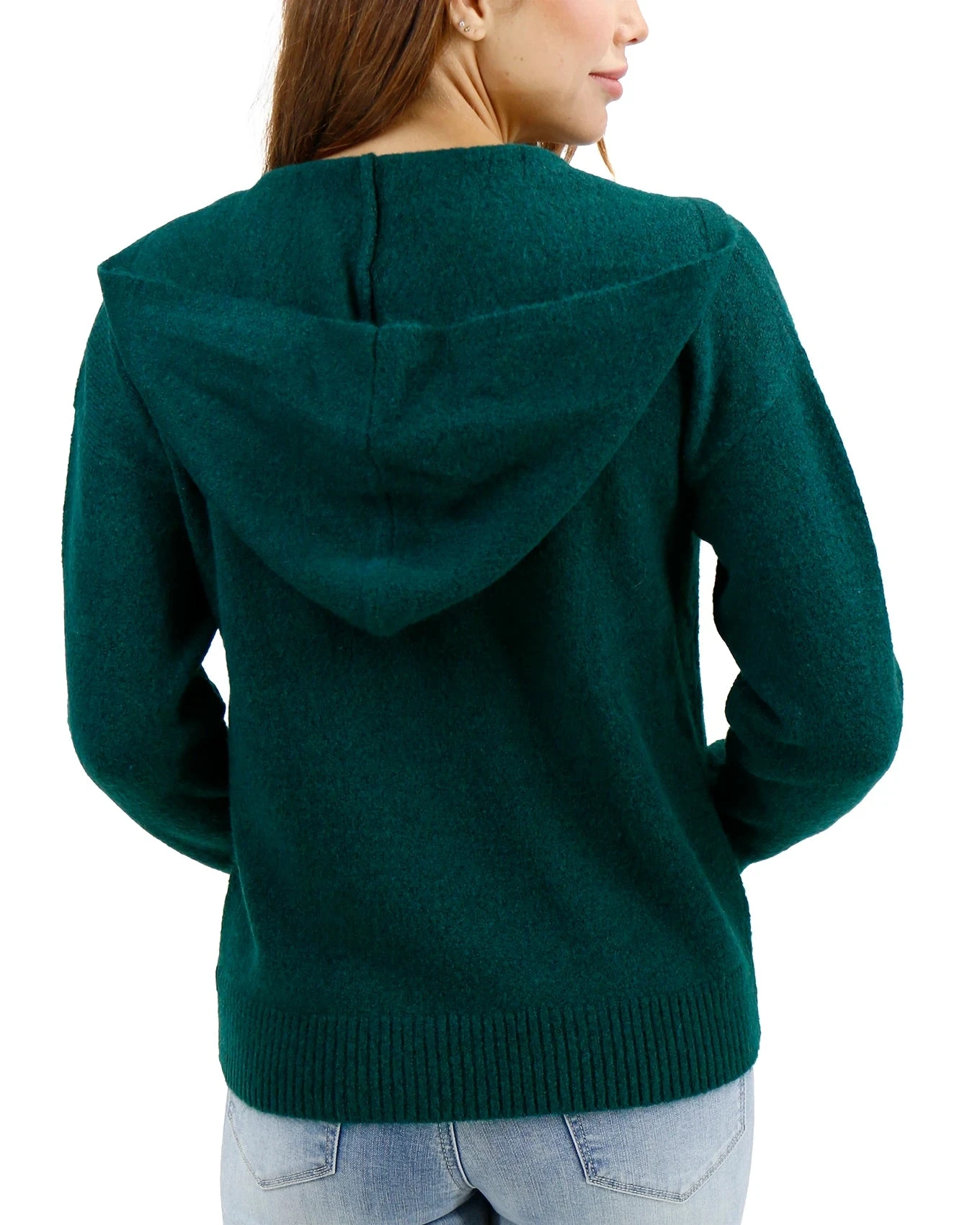 - Soft knit sweater hoodie in a two-tone deep green hue that’s perfect for the season