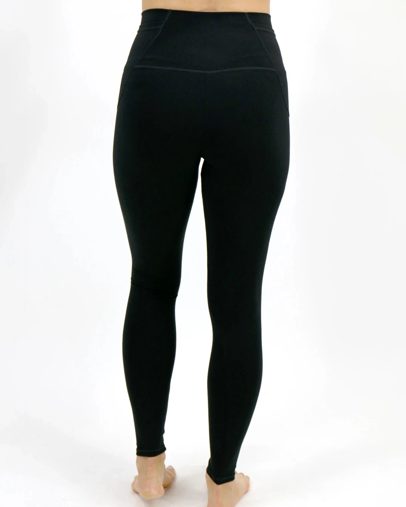 High waist yoga style legging with wide waistband and two functional hip pockets with detail seaming. The soft knit fabric has great stretch and a soft cotton feel. Comfort fit legging, true to size. If between sizes or you desire a more compression fit, size down.