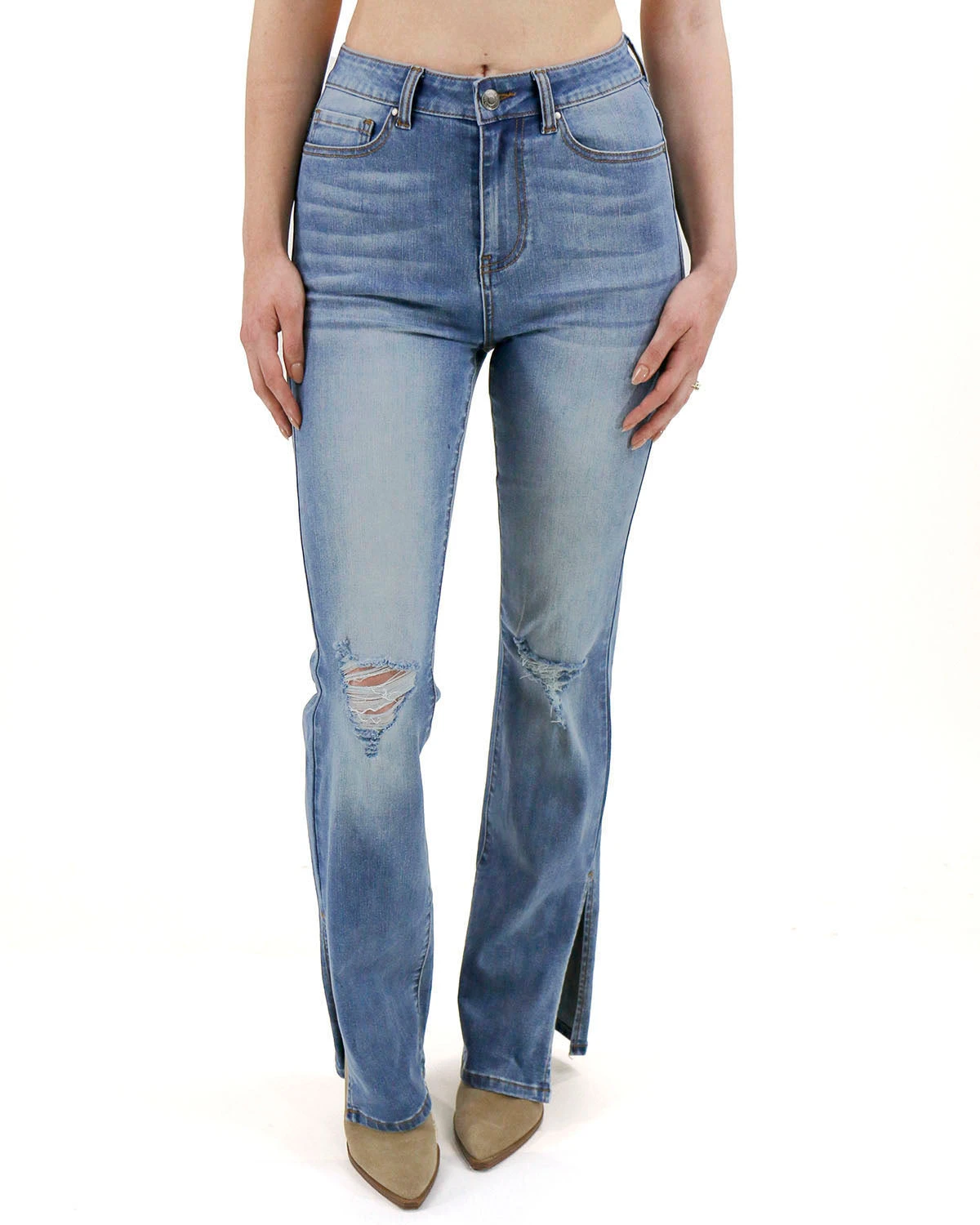 Kick it up a notch with a new pair of head-turning flares in your closet! The new Split Flare Denim feature our new, wonderful stretch denim, a higher rise, and a sleek fitted leg with slit flare bottom. Featuring our new wonderful stretch denim, a higher rise and a sleek fitted leg with slit flare bottom.’