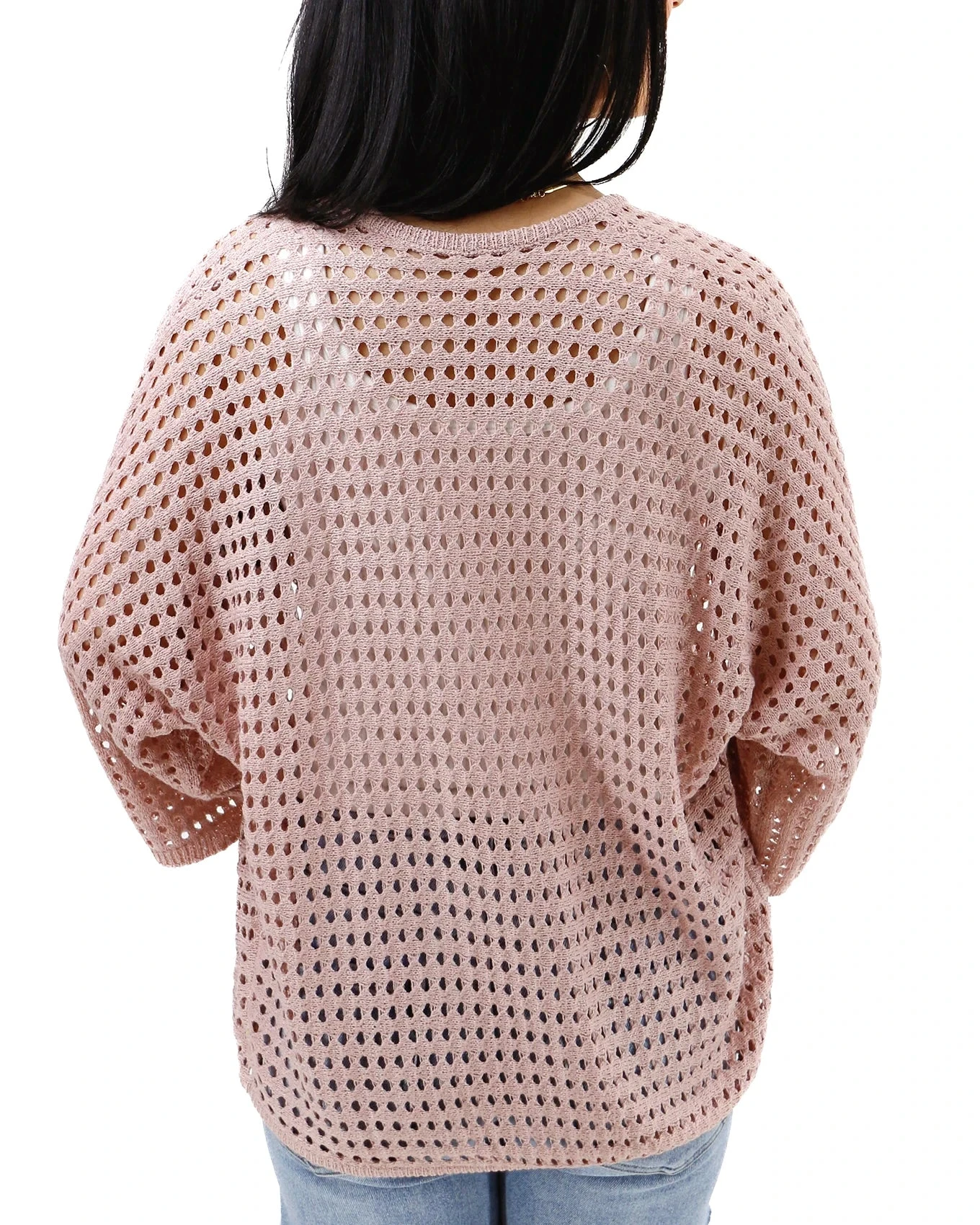 Circle cut, open knit sweater cardigan. Open knit pointelle with dolman 3/4 length sleeves. Fit is true to size and slim fit through hip. If curvy through hip, size up. Or size up if you want a more oversized fit.