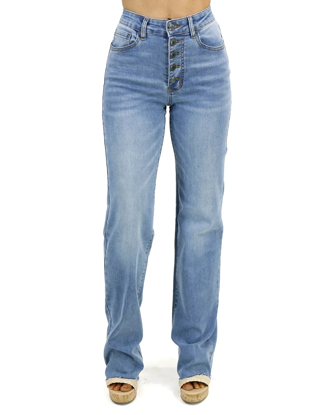 High-rise, straight leg, 5 pocket denim with button fly closure. Denim has good stretch. Leg is wider fit with trendy cuff (side tacked for easy removal and customizing inseam). Cuff can be untacked and worn longer or raw cut to be shorter. Fit is true to size fit with a good stretch. If between sizes and prefer to use a lot of stretch in your denim, size down.