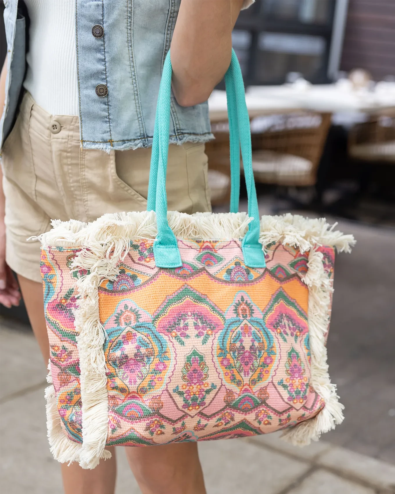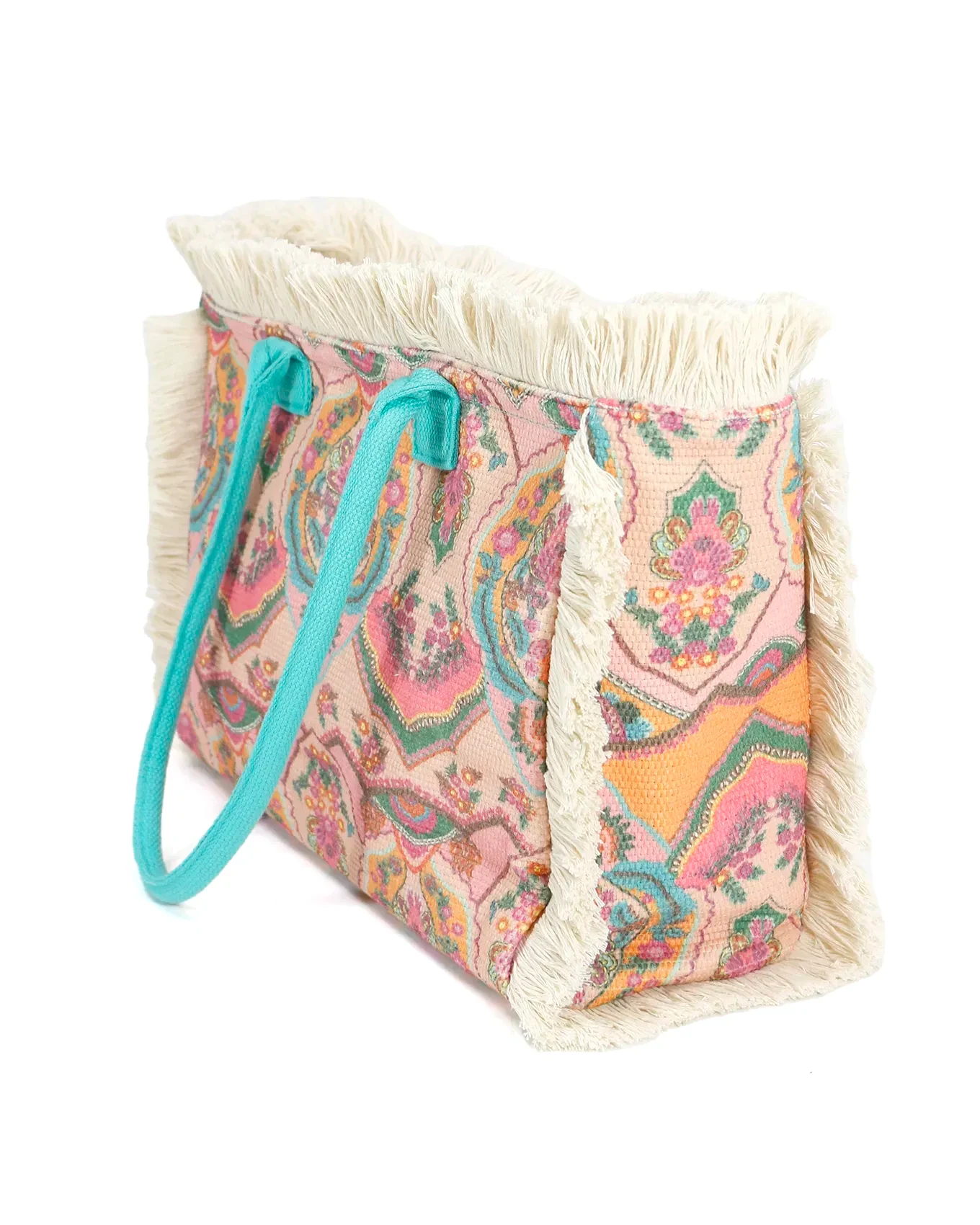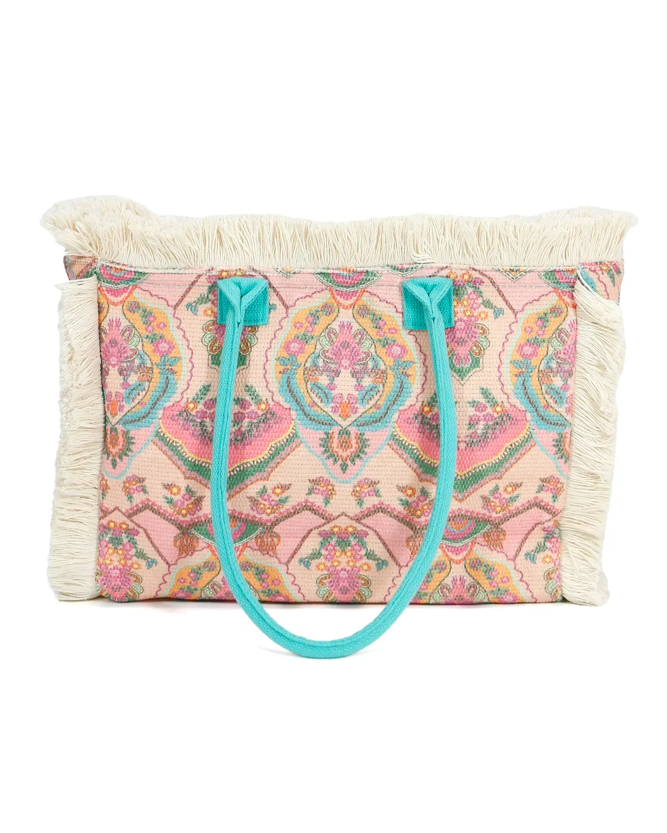 - Cute summer fringe tote bag in colorful tapestry print with teal handles