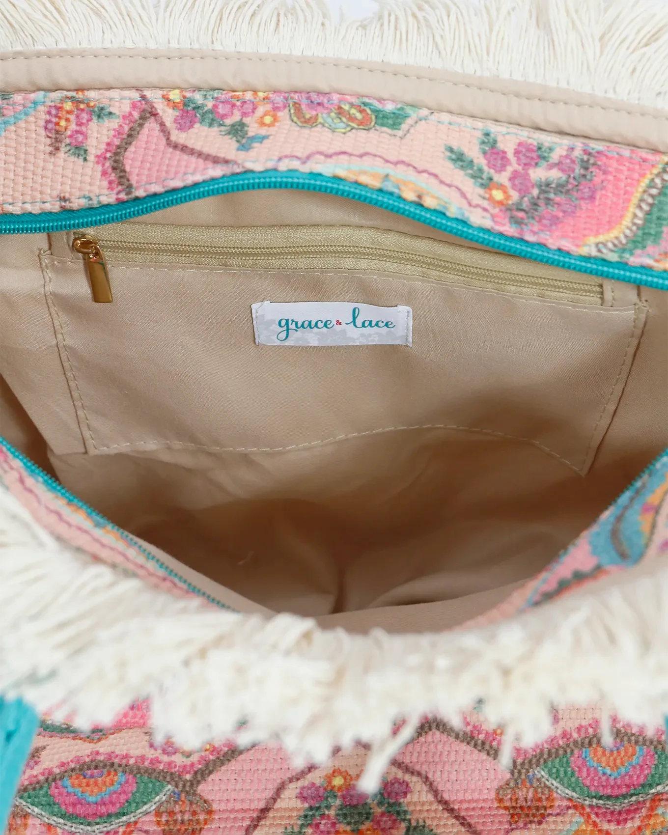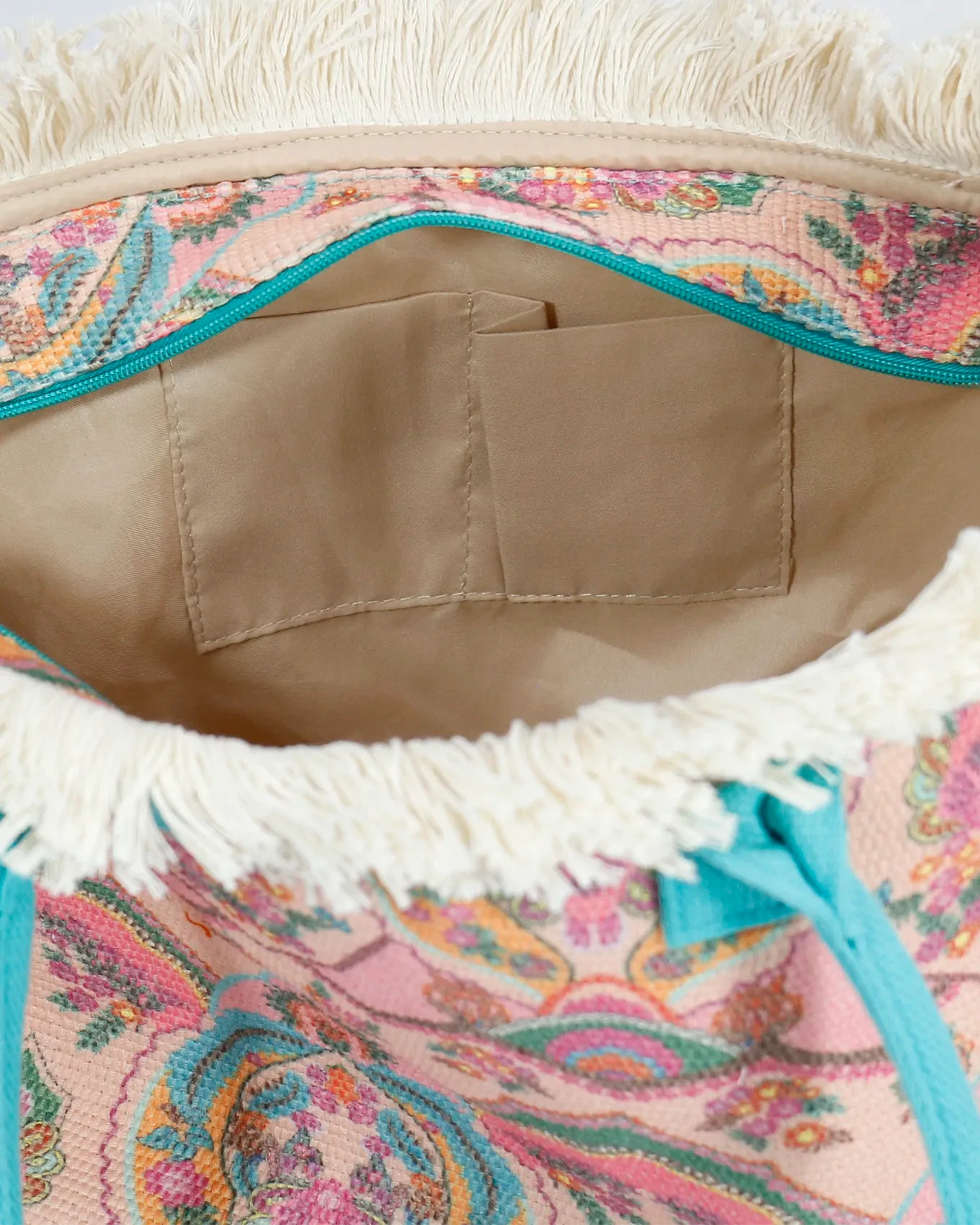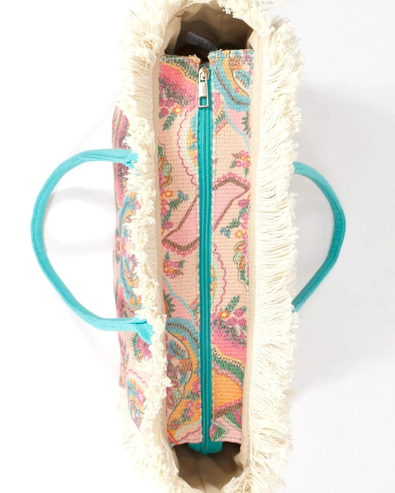 - Cute summer fringe tote bag in colorful tapestry print with teal handles