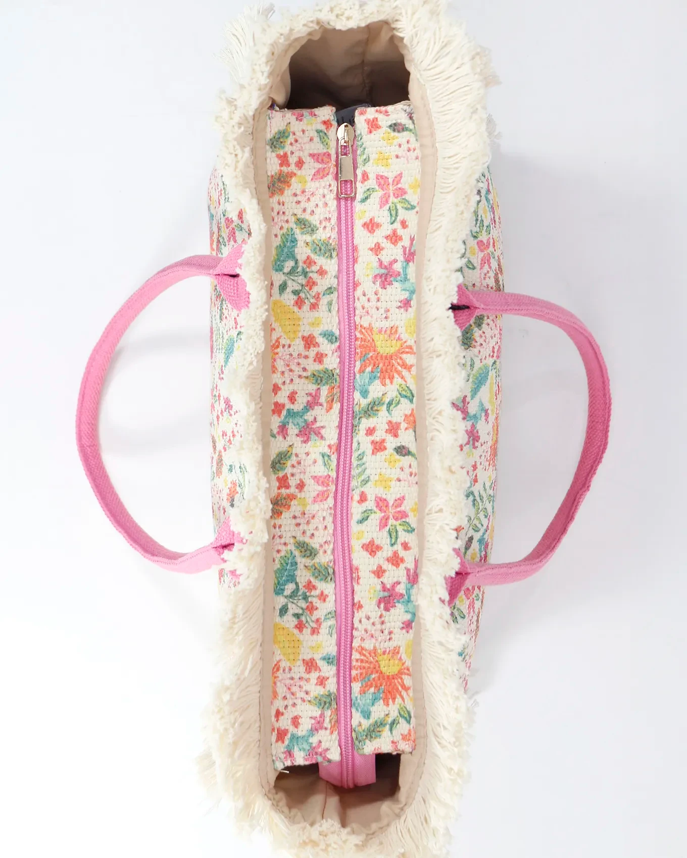 Summer canvas tote with fringe detail, top handles, and functional zipper closure. Inside features one zipper closure pocket and two open pockets.