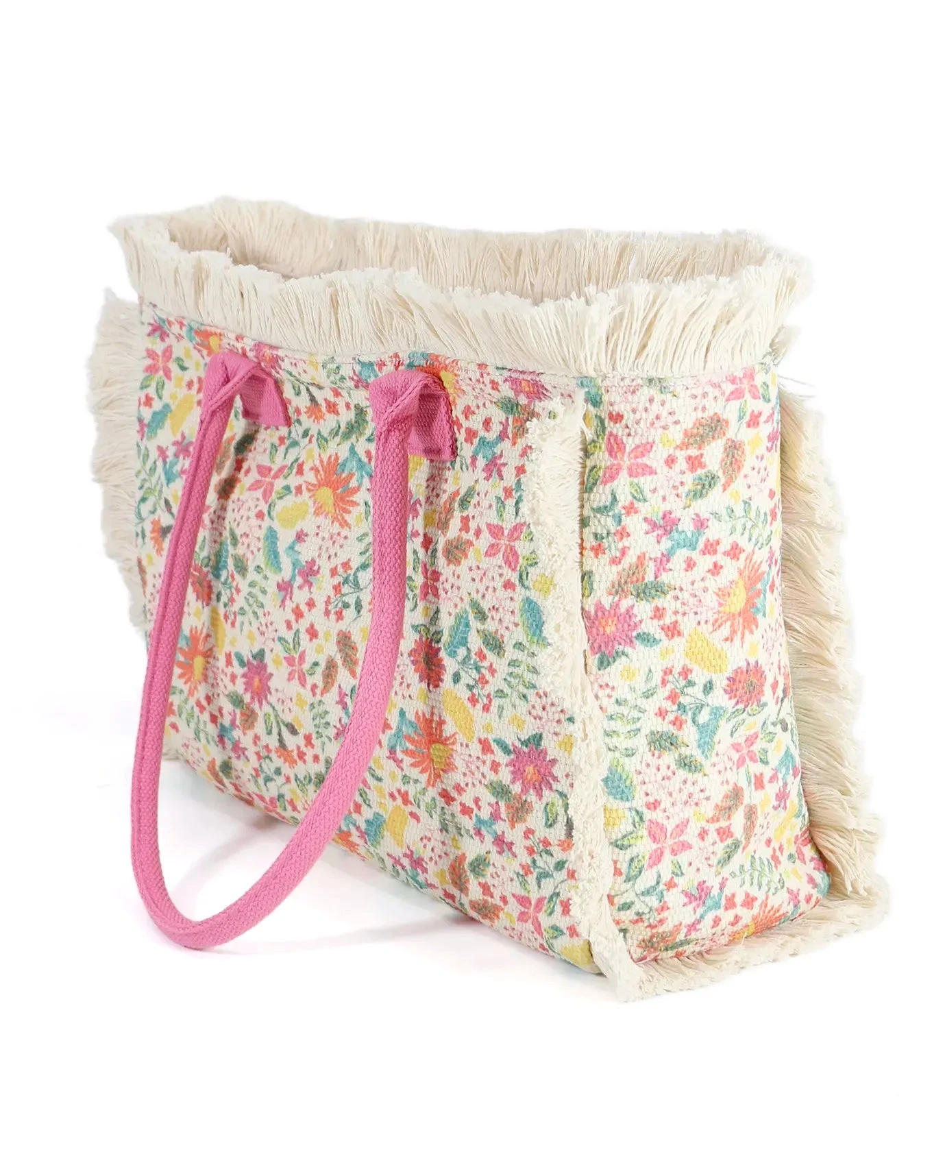 - Cute summer fringe tote bag in wild flower floral print with purple handles