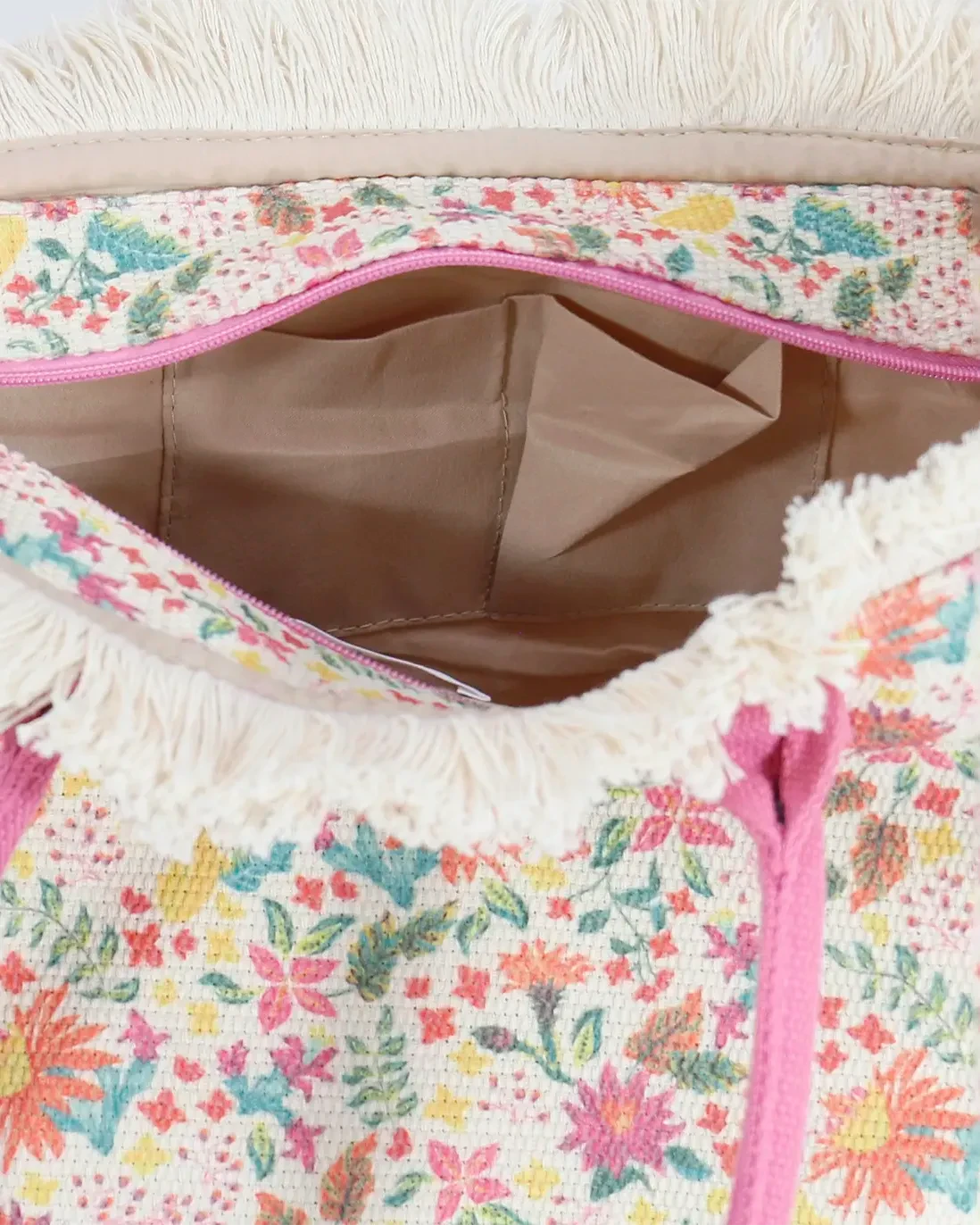 Let your accessories have some summer fun! The Summer Fringe Tote keeps you ready for anything this summer season! This colorful canvas tote bag features a boho-inspired fringe trim for a pop of fun texture, and complements the pretty wild flower floral print. The size makes this tote easy to use for travel or daytime adventures, and keeps all of your essentials neatly stashed away with its zipper closure and interior pockets. You’ll love adding a dash of color and fun to your summertime look with this cute summer tote bag!